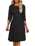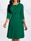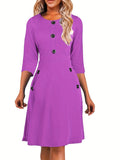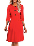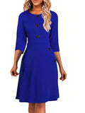 Sale Solid Button Crew Neck Half Sleeve High Waist Dress, Elegant Ruffled Hem Slim Midi Dress