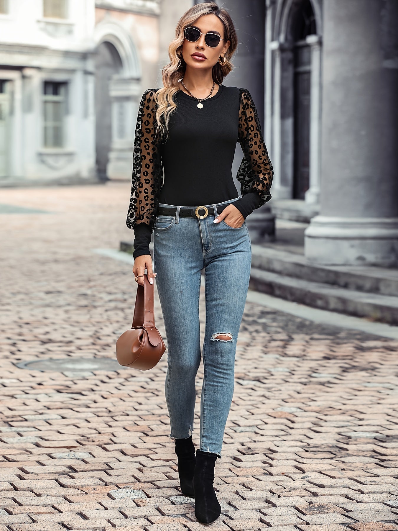 Black Rhinestone Sheer Mesh Slim Fit Long Sleeve Top
