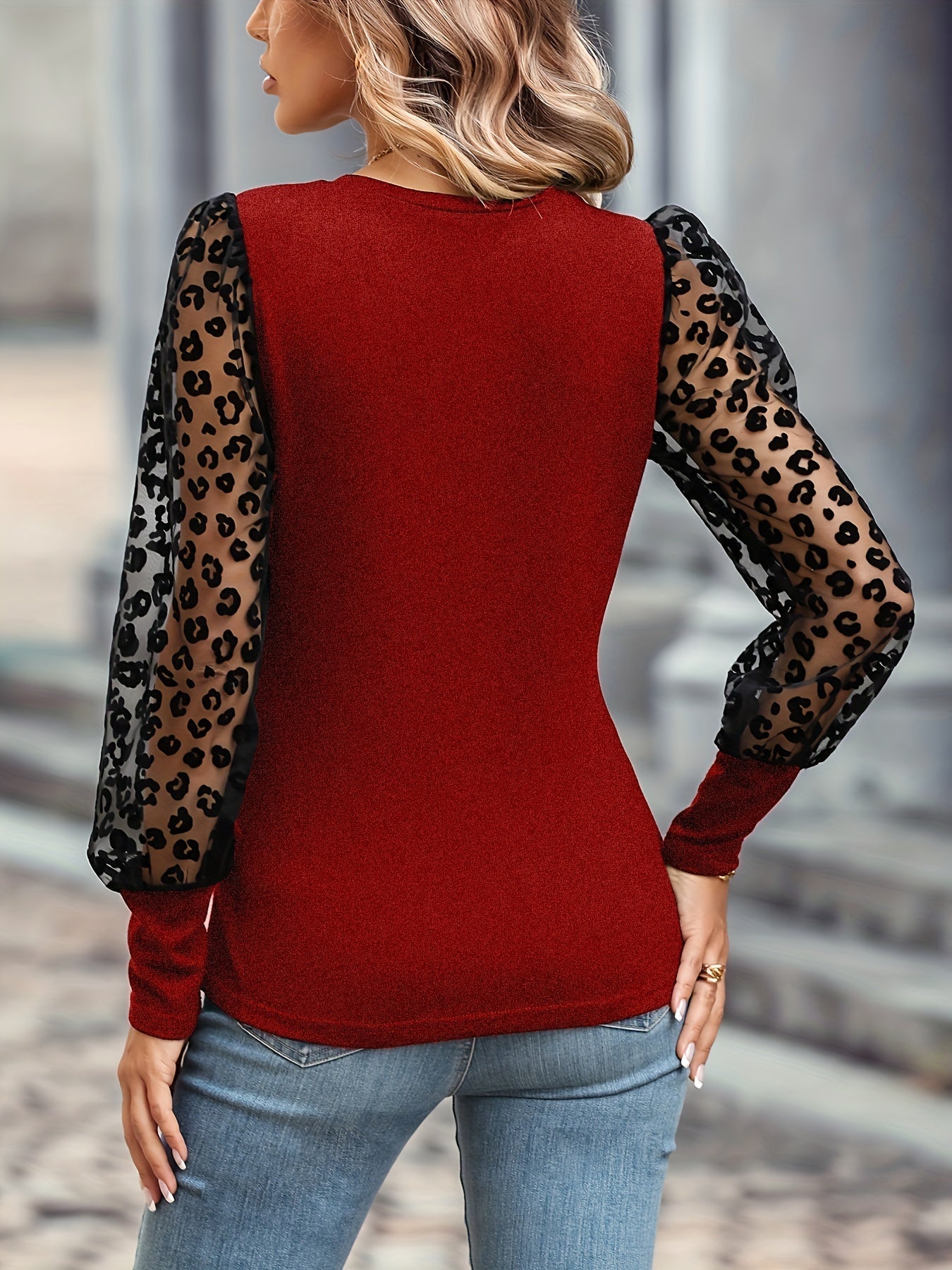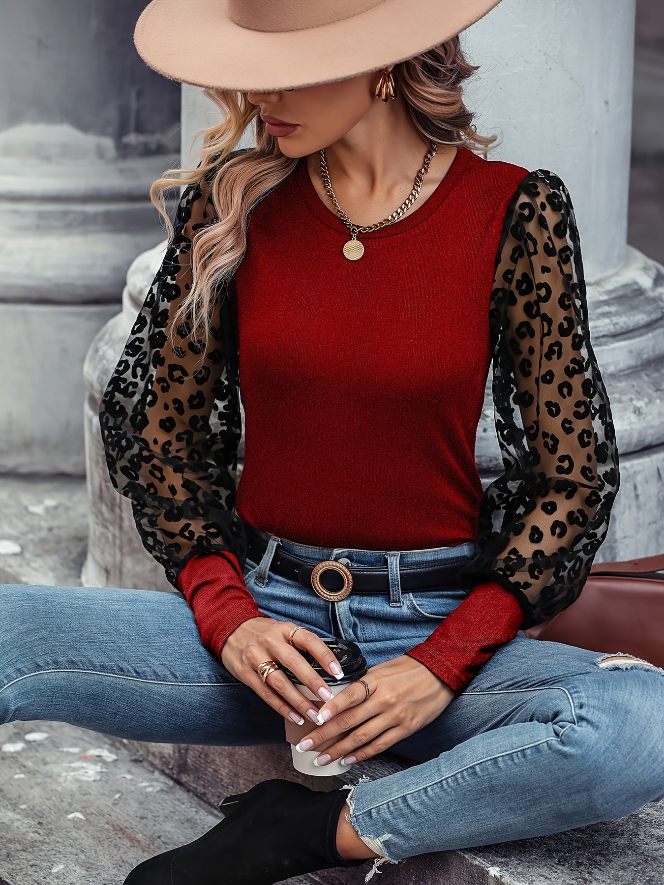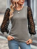 Solid Color Lace Patchwork Ballon Sleeve Ribbed Knit Tops, Elegant Everyday Blouse
