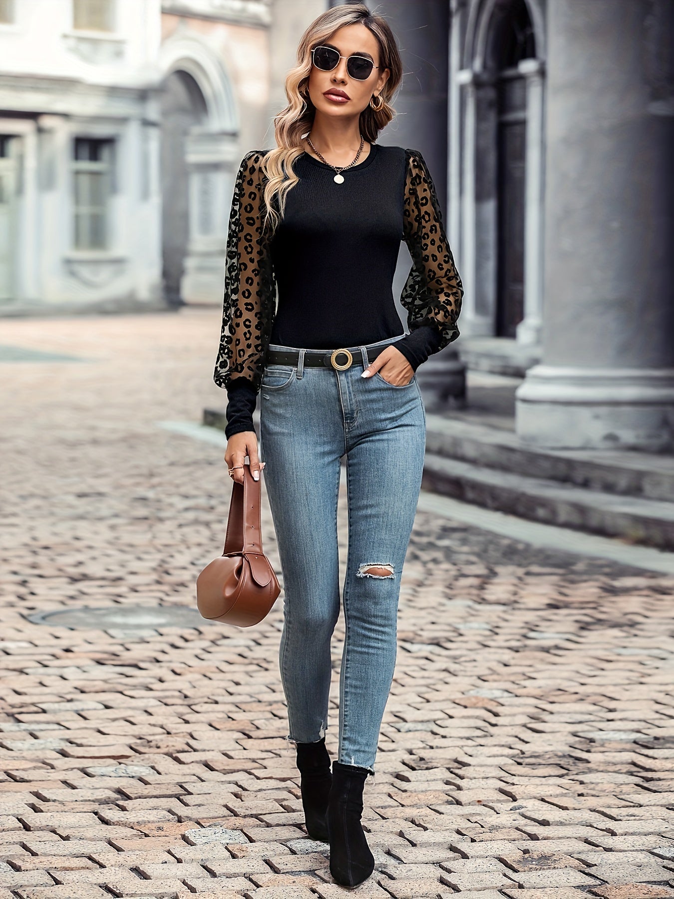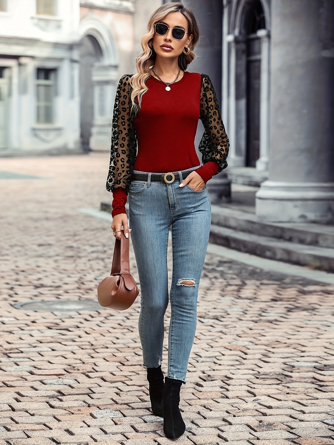 Sale Elegant Floral Print High-Stretch Round Neck Long Sleeve Top