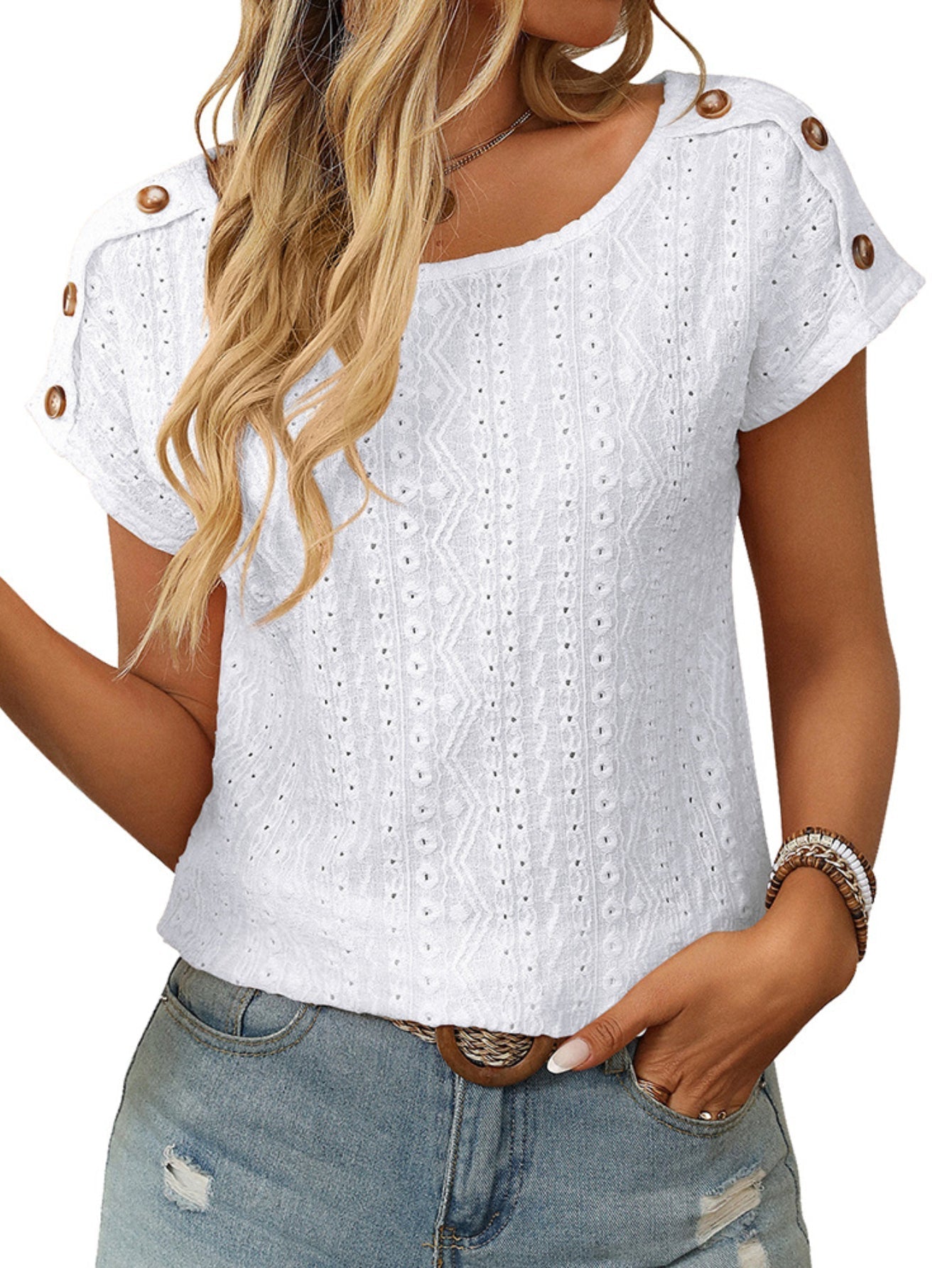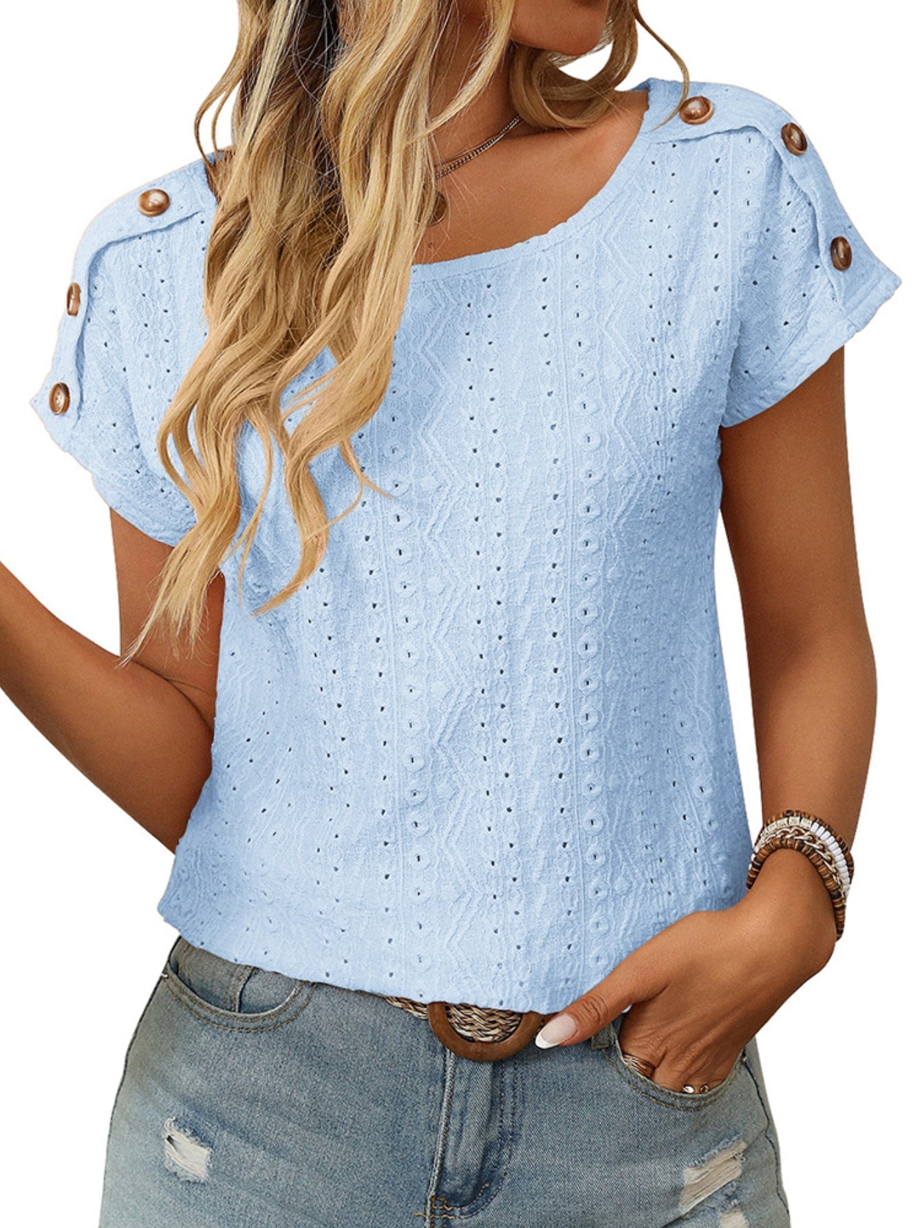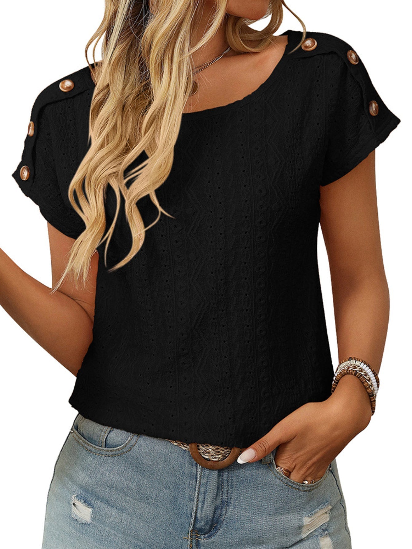 Solid Color Round Neck Shoulder Button Embroidery Hollow Short Sleeved T-shirt