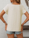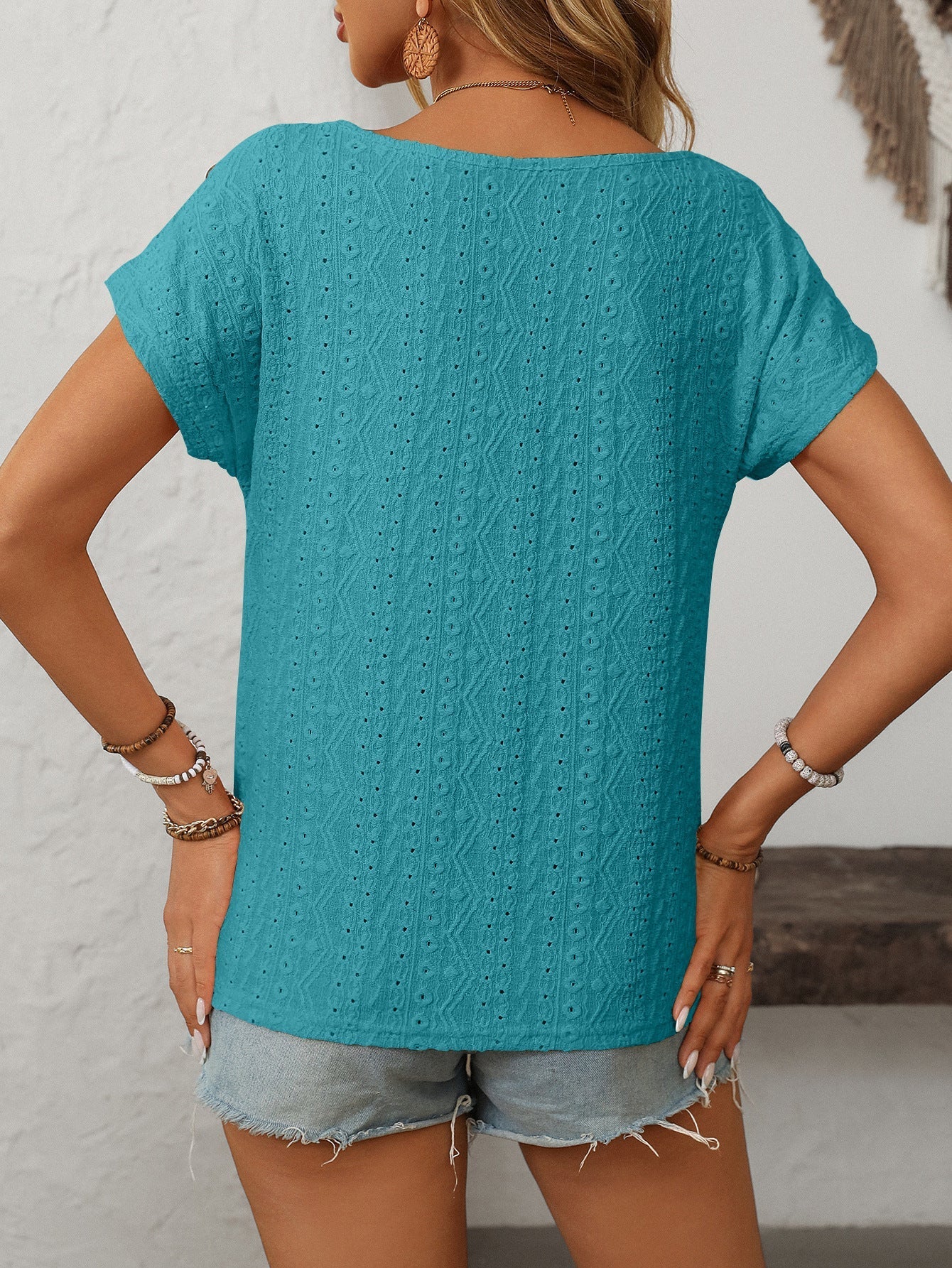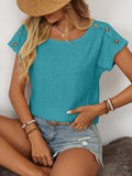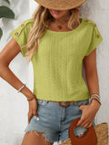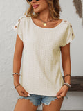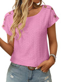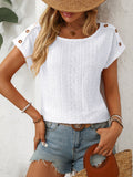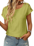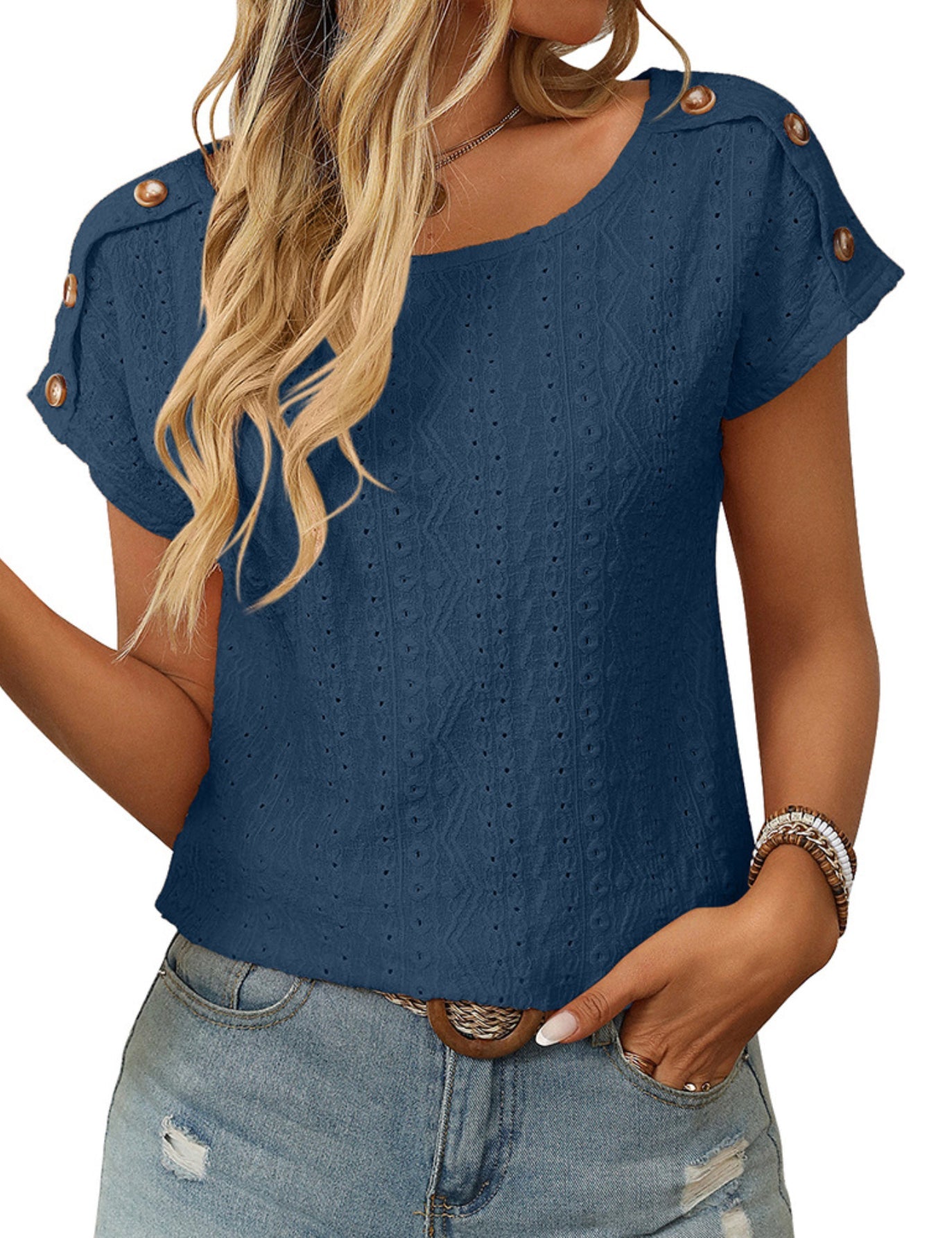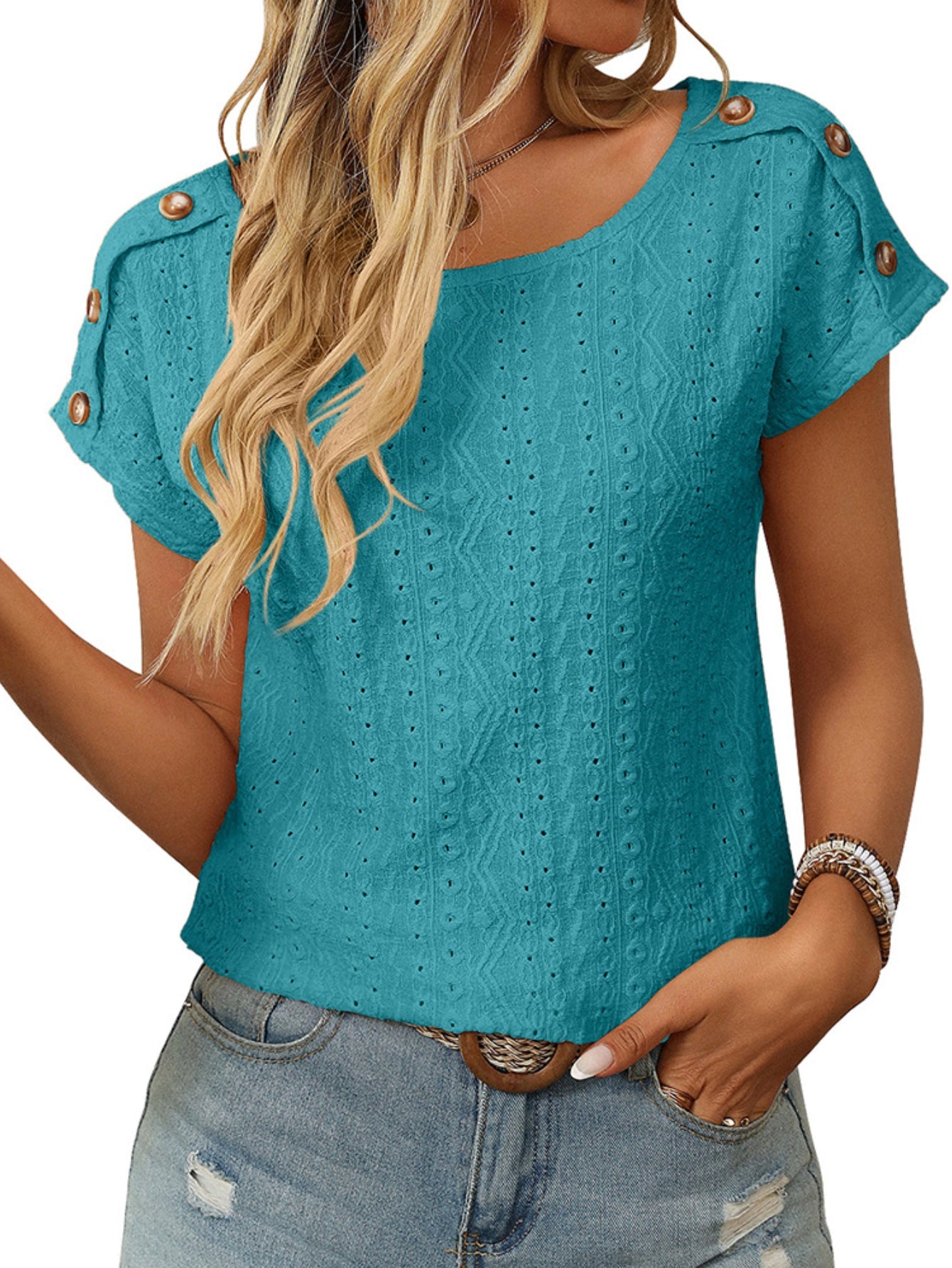 Solid Color Round Neck Shoulder Button Embroidery Hollow Short Sleeved T-shirt