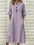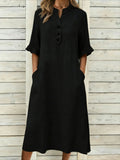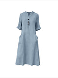 Solid Color Textured Half Sleeve V Neck Elegant Button Sundress Loose Fit High Waisted A Line Flowy Pockets Midi Dress