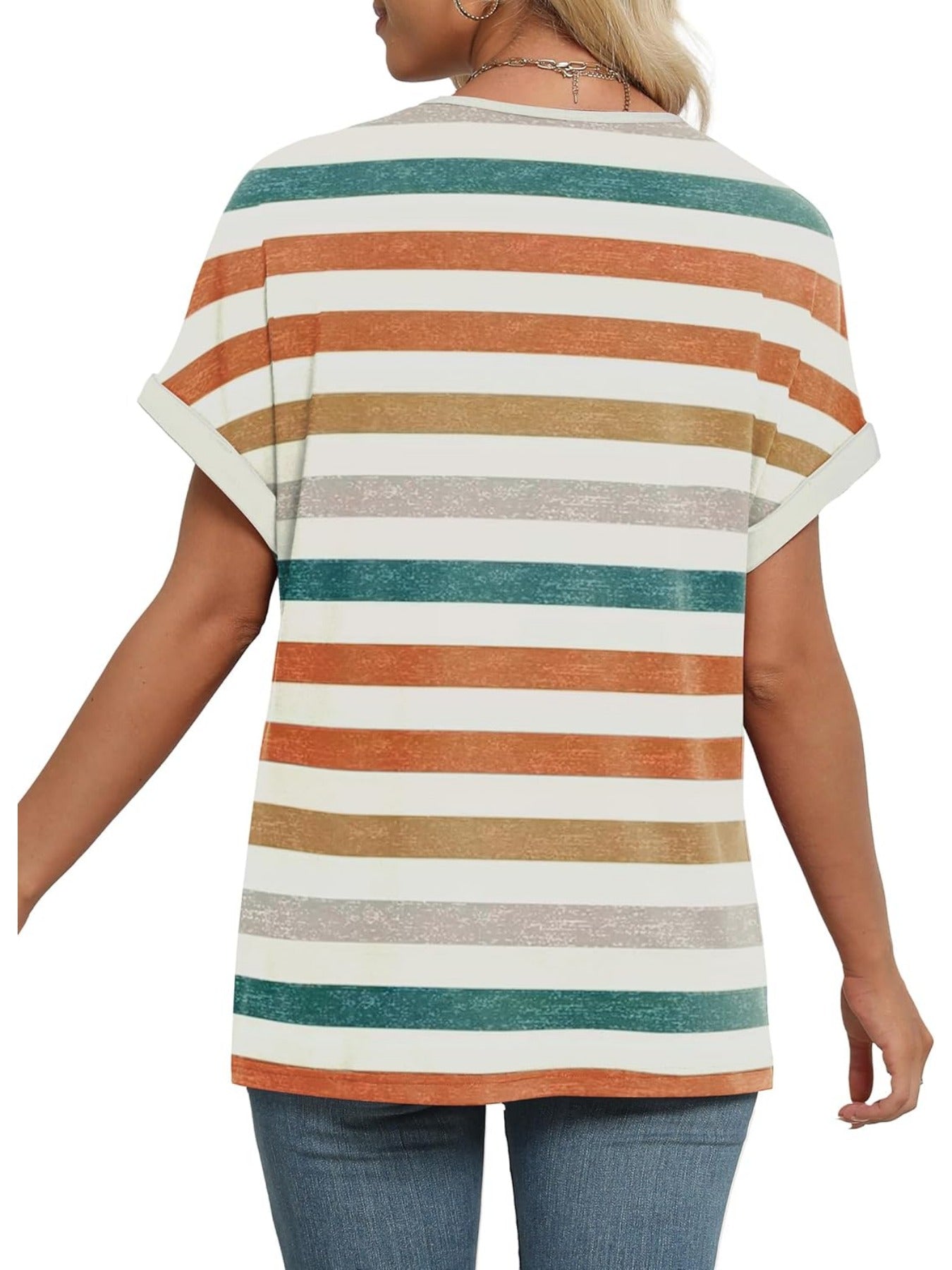 Sale Striped Botton Crew Neck T-Shirt, Elegant Long Sleeve T-Shirt