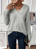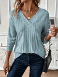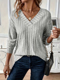 Sale Solid Color V Neck T-Shirt, Casual Long Sleeve Ribbed Top