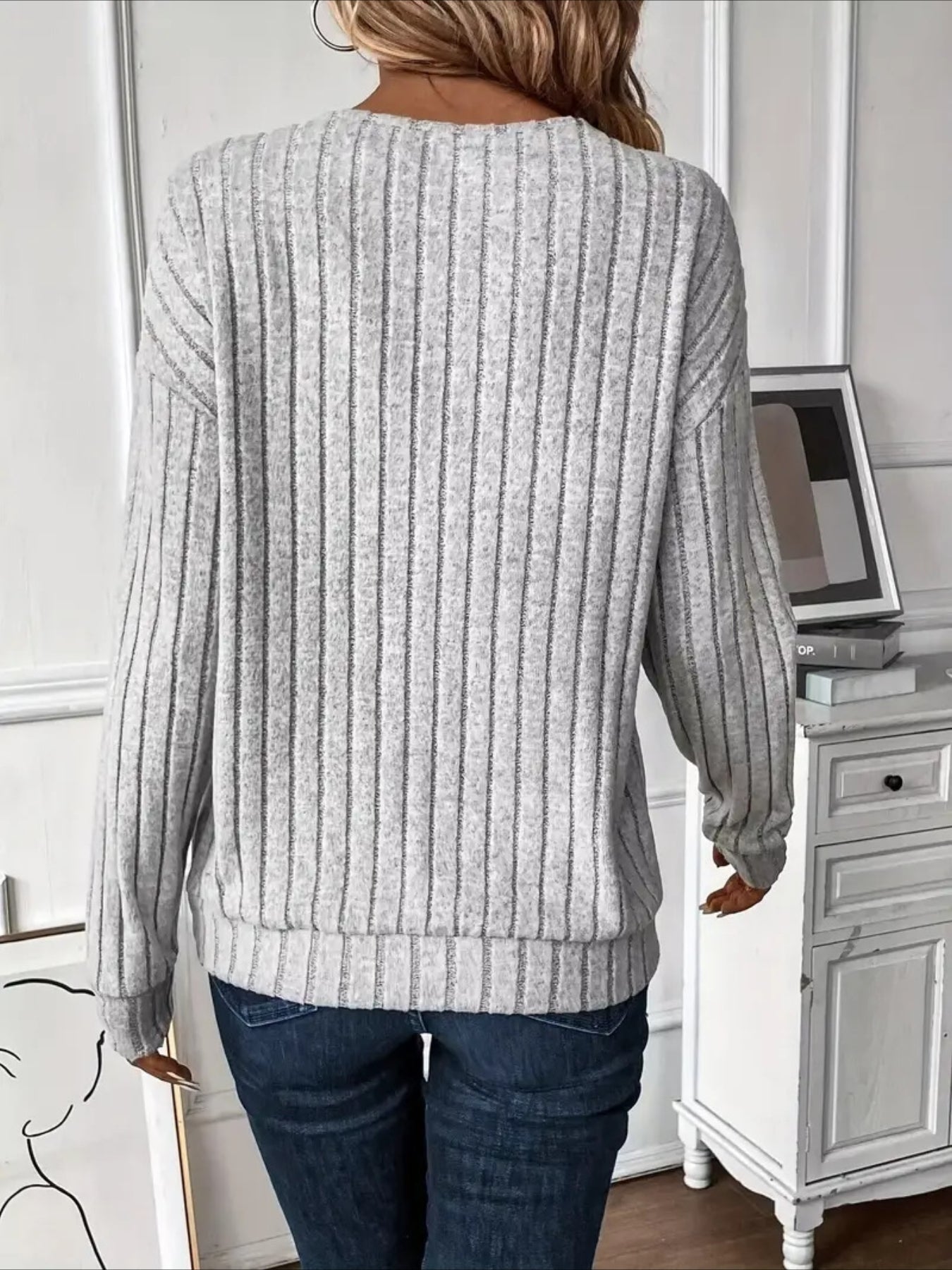 Sale Striped Botton Crew Neck T-Shirt, Elegant Long Sleeve T-Shirt