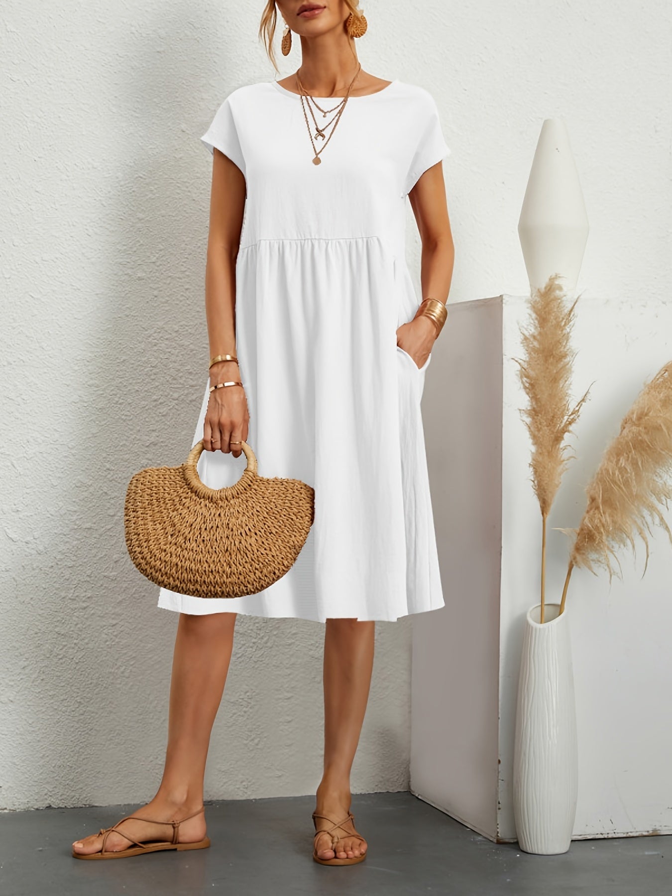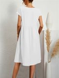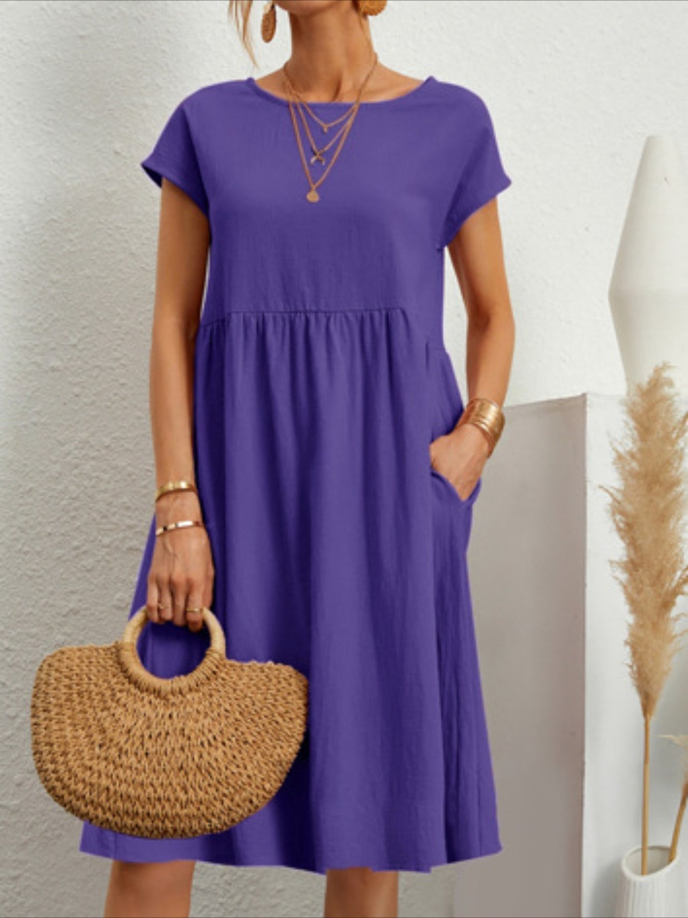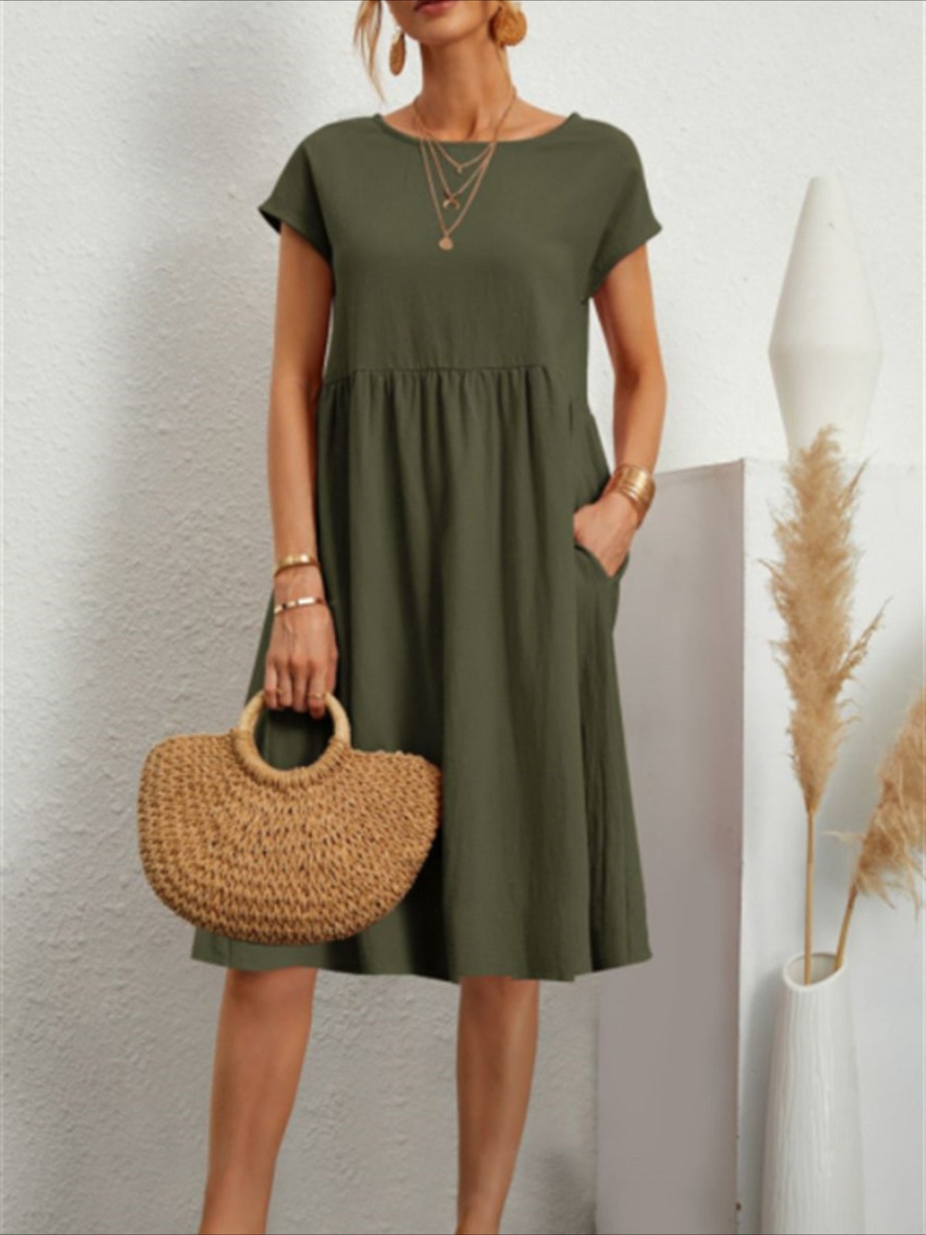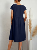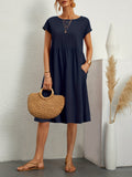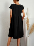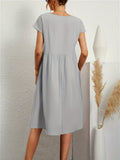 Sale Solid Crew Neck Dress With Pocket, Casual Short Sleeve Midi Dress