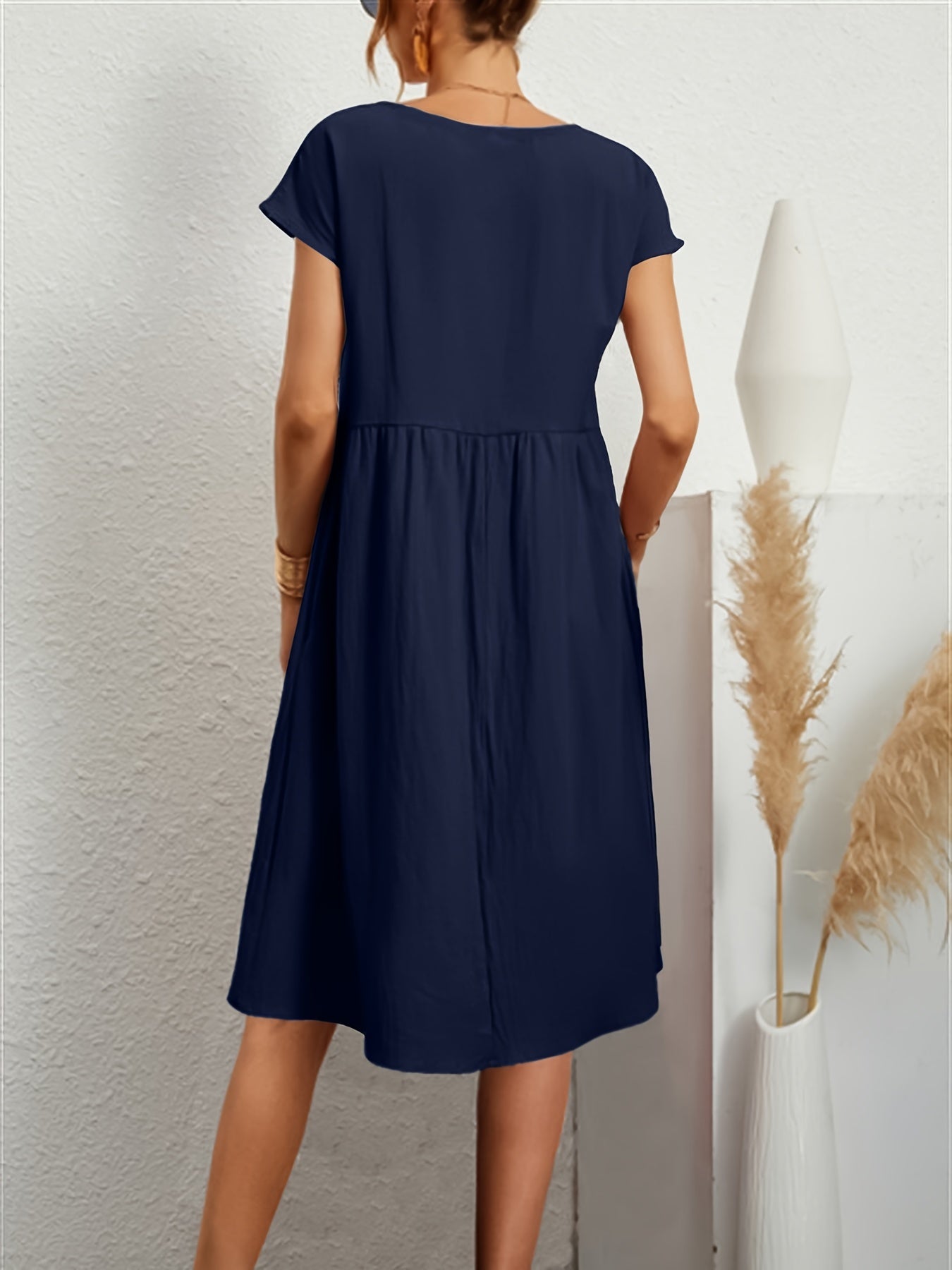 Solid Crew Neck Dress With Pocket, Casual Short Sleeve Midi Dress