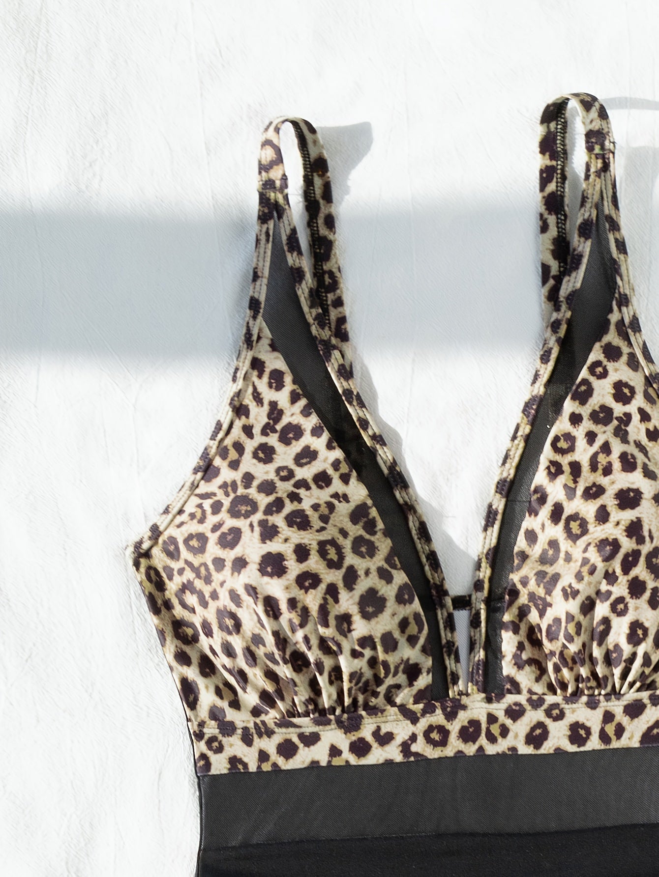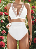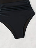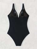 Sale Solid Mesh Contrast One-piece Swimsuit, V Neck Stretchy Ruched Bathing Suits