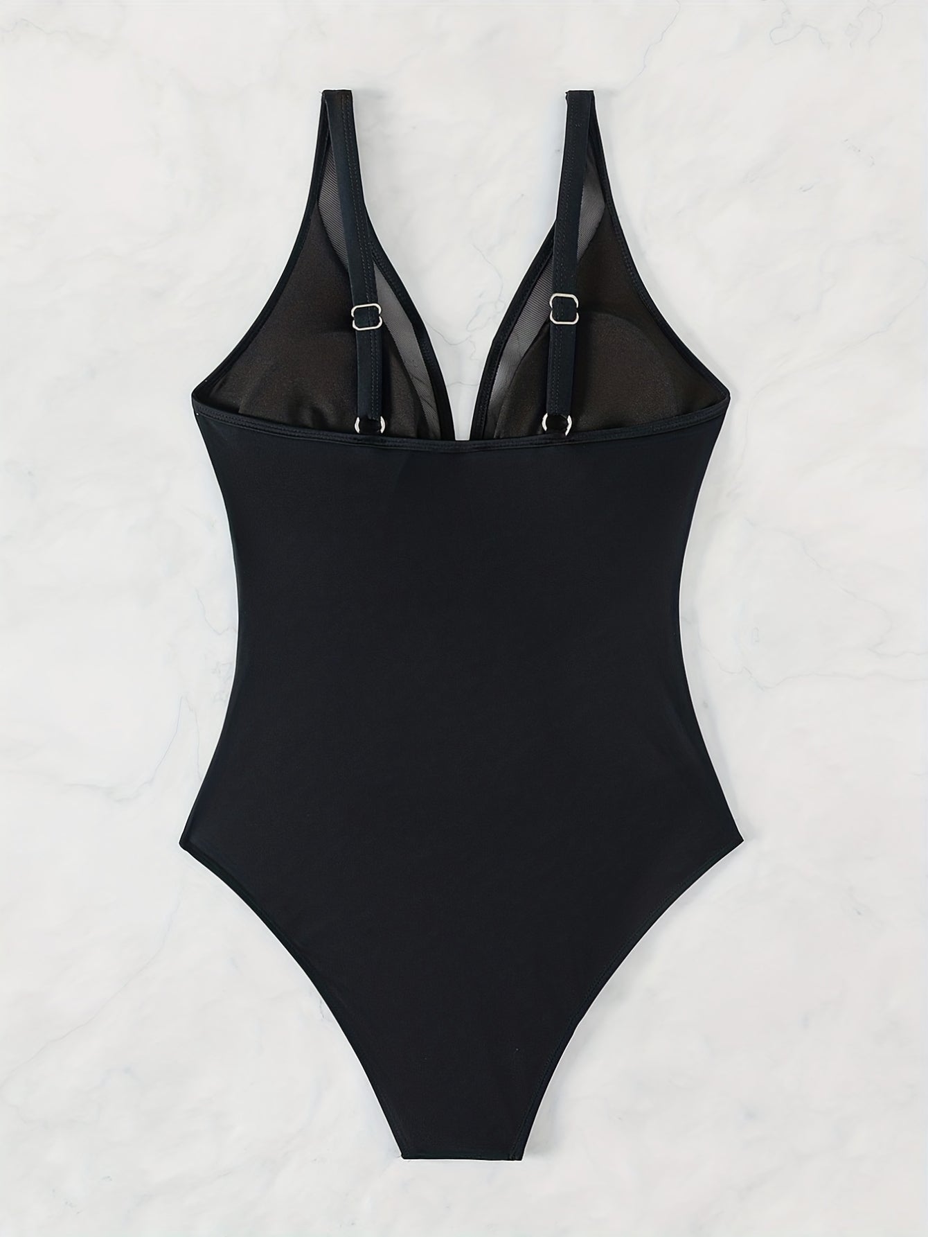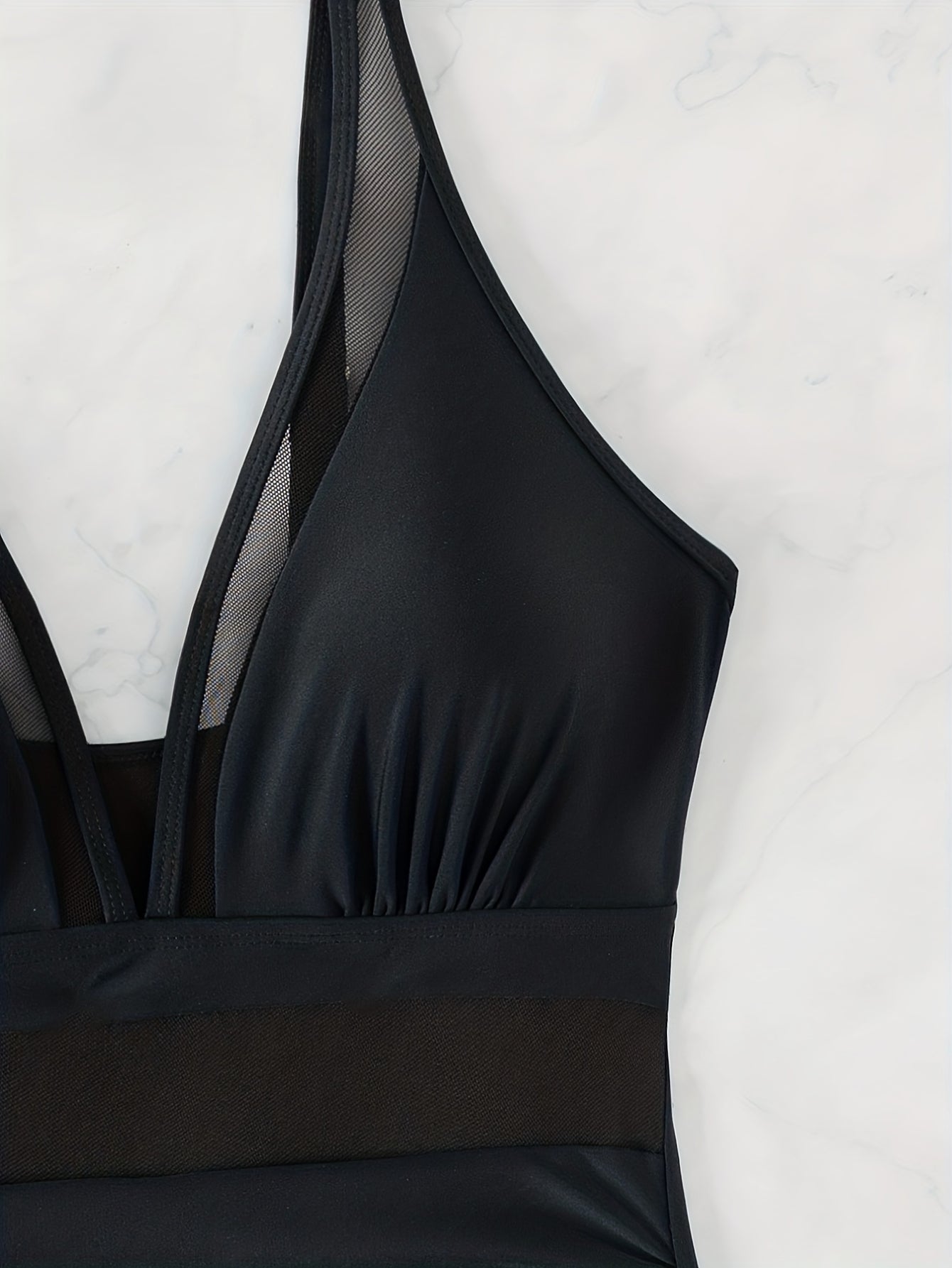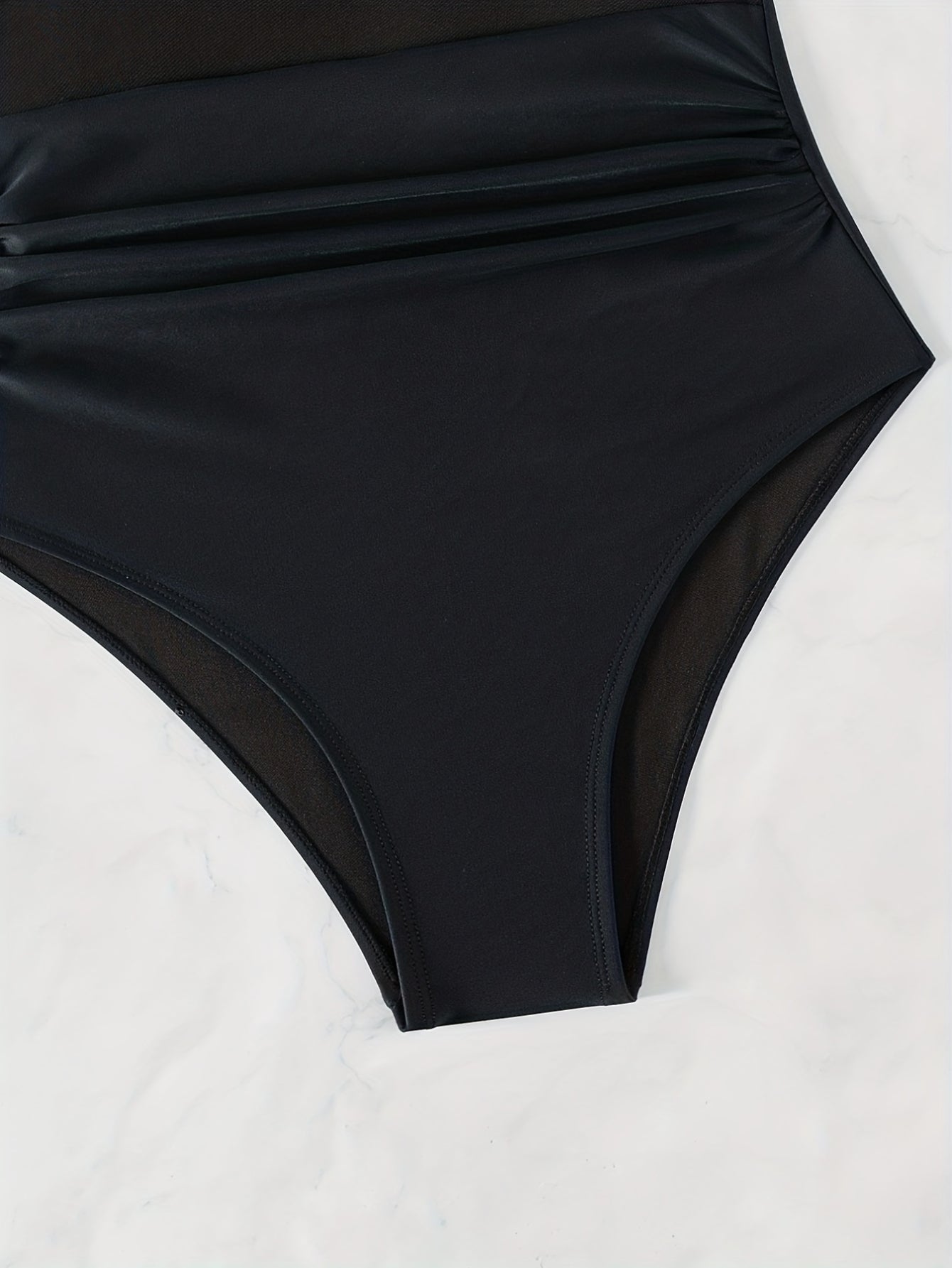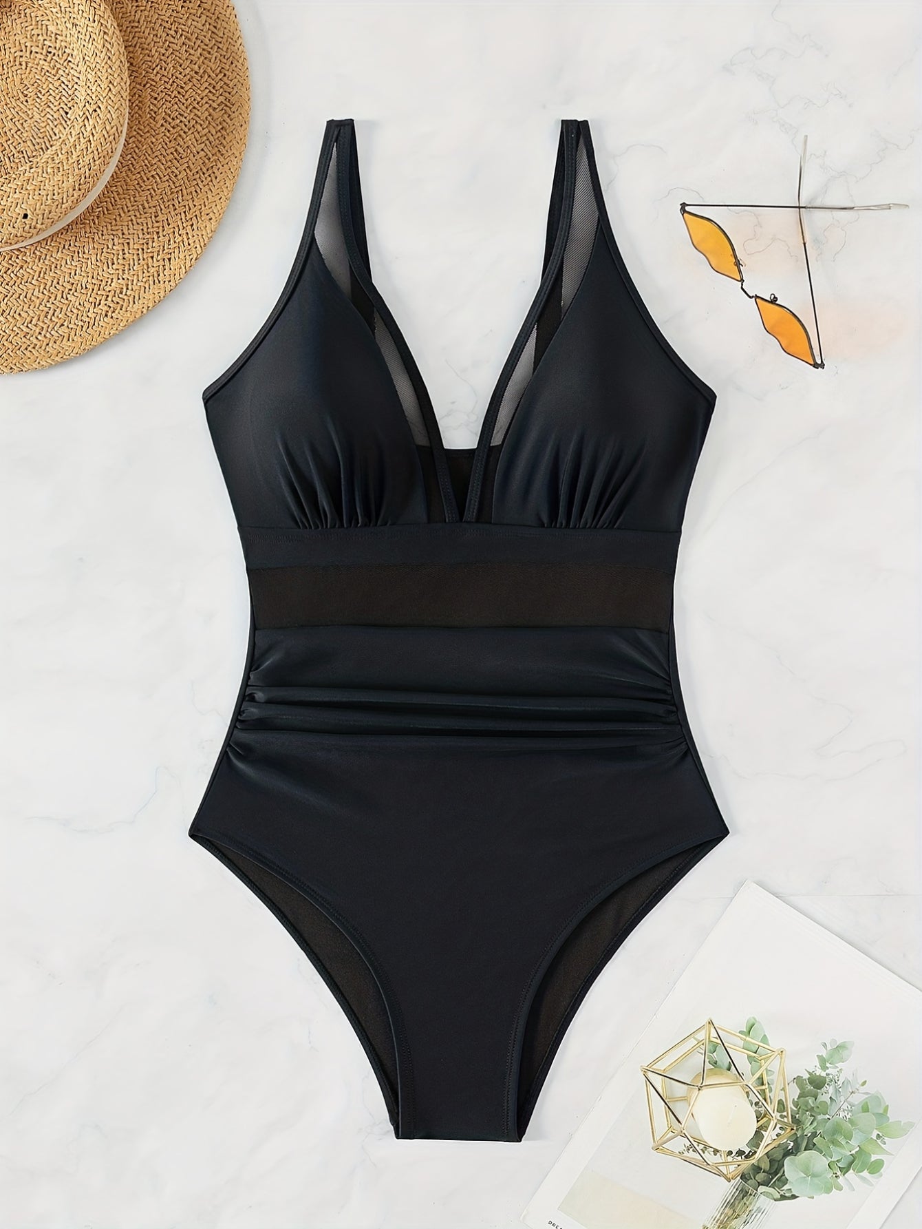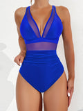Solid Mesh Contrast One-piece Swimsuit, V Neck Stretchy Ruched Bathing Suits