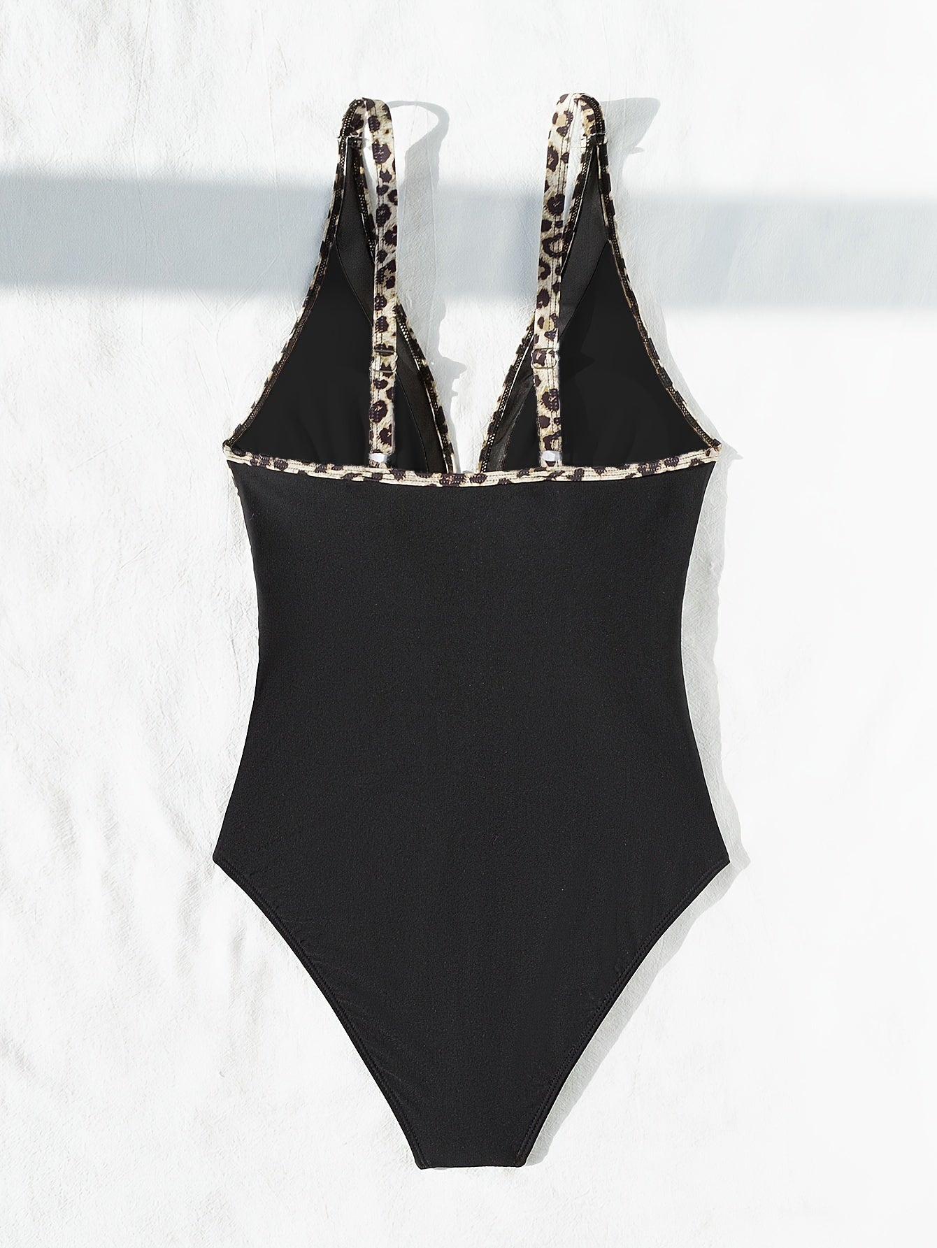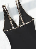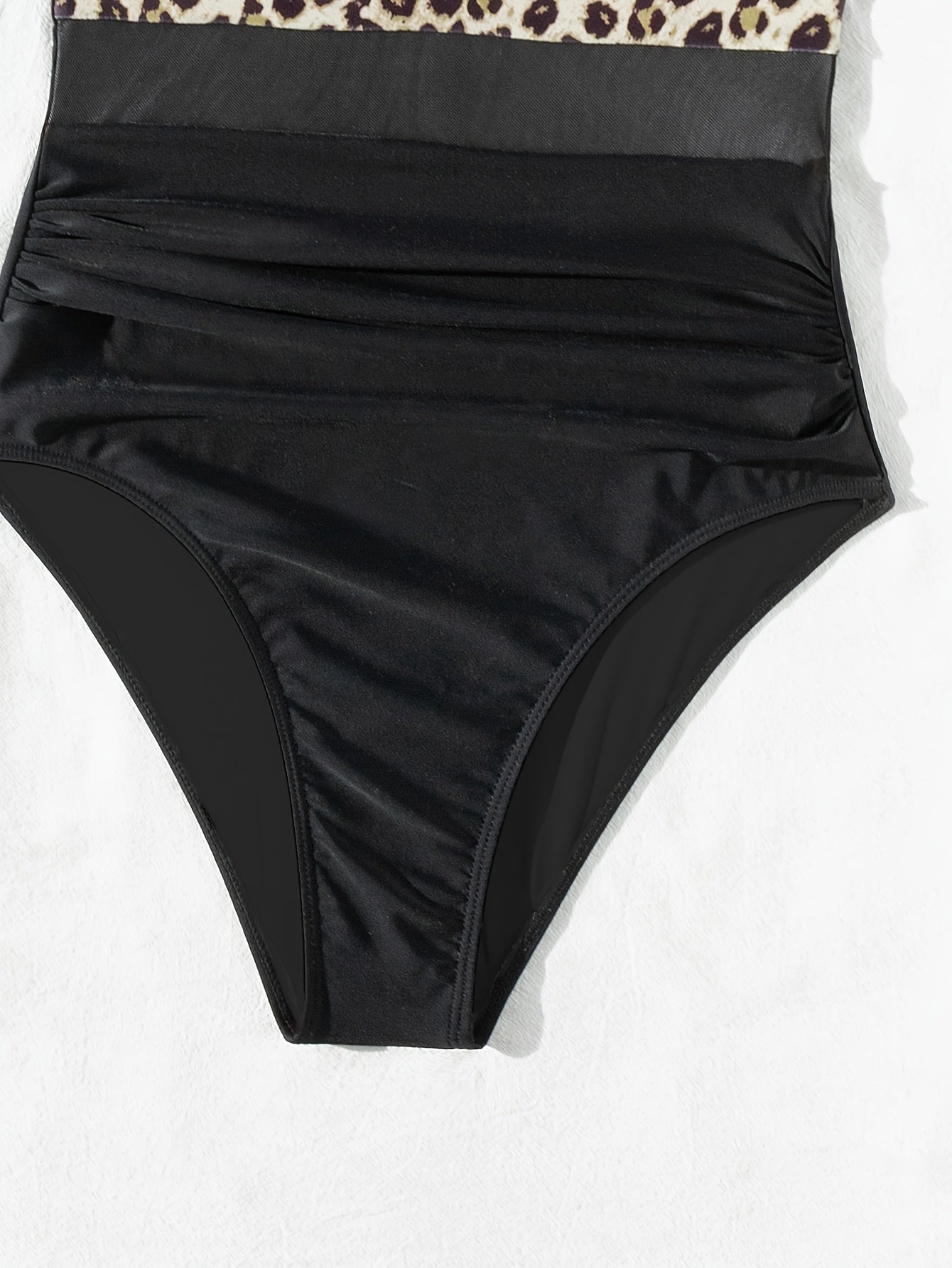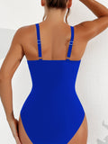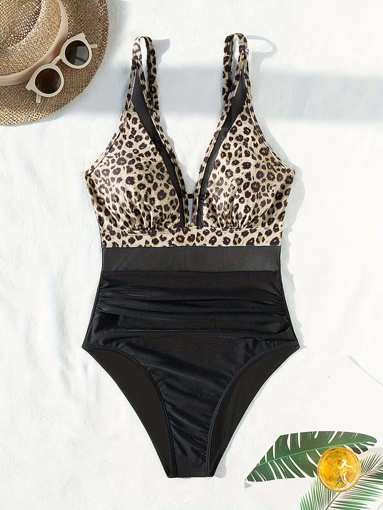 Solid Mesh Contrast One-piece Swimsuit, V Neck Stretchy Ruched Bathing Suits