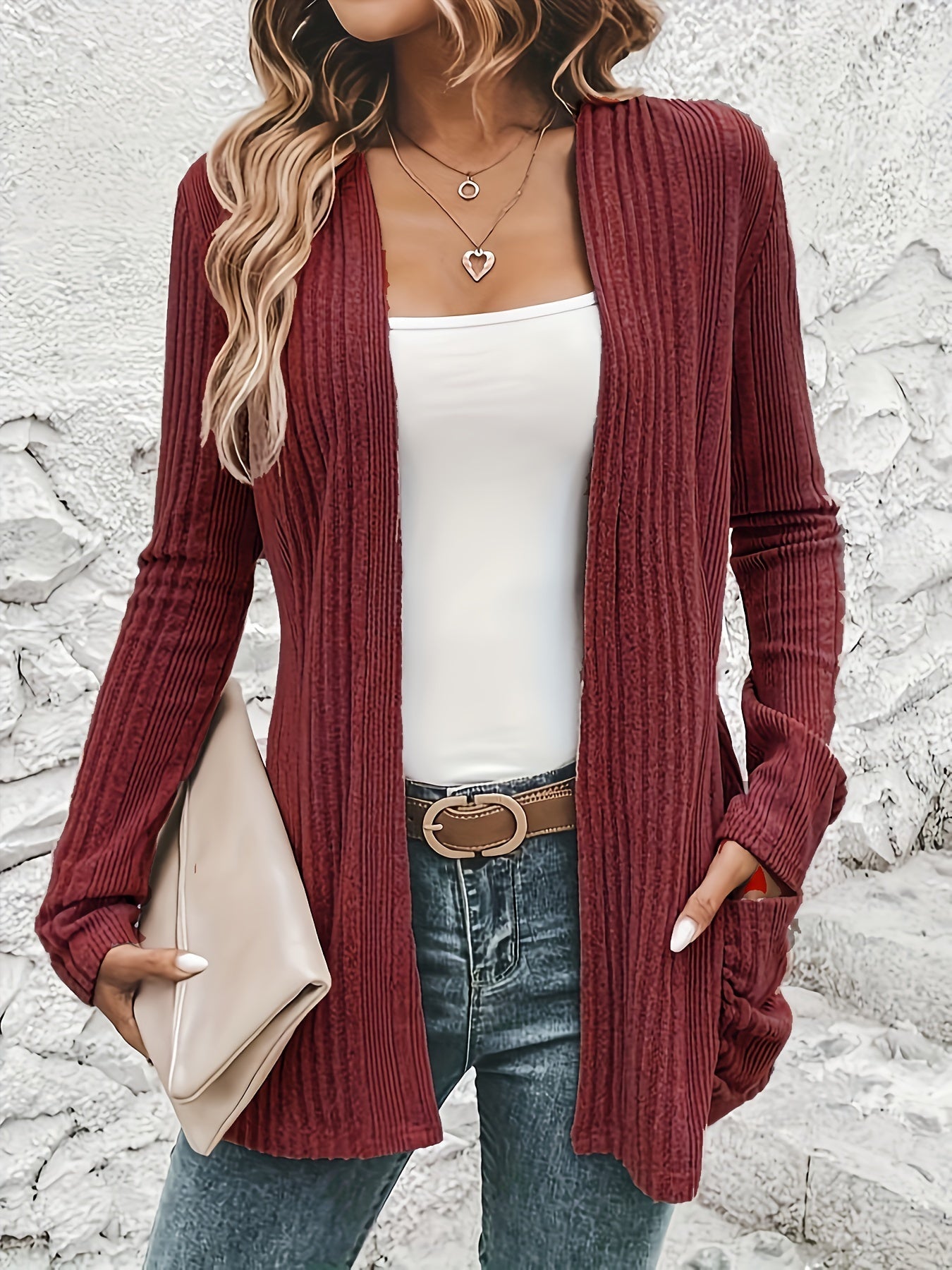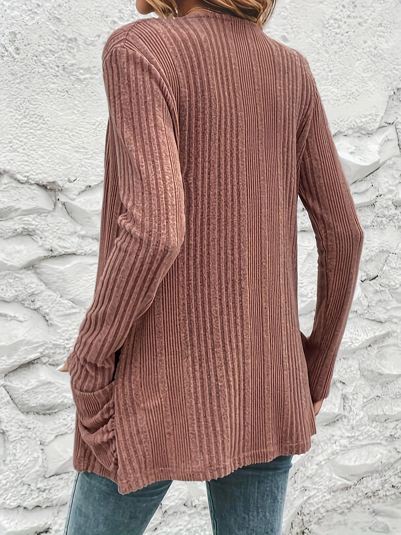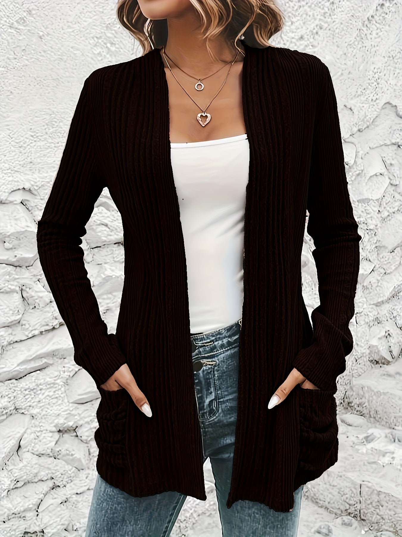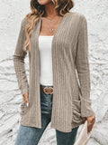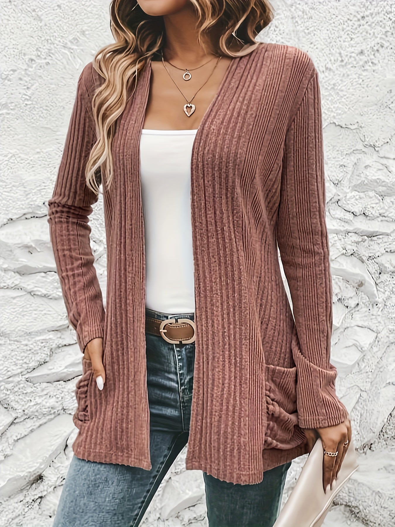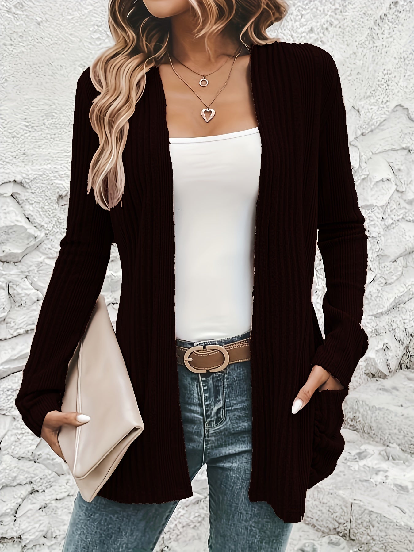 Solid Open Front Rib Knit Cardigan, Casual Long Sleeve Slim Cardigan With Pocket