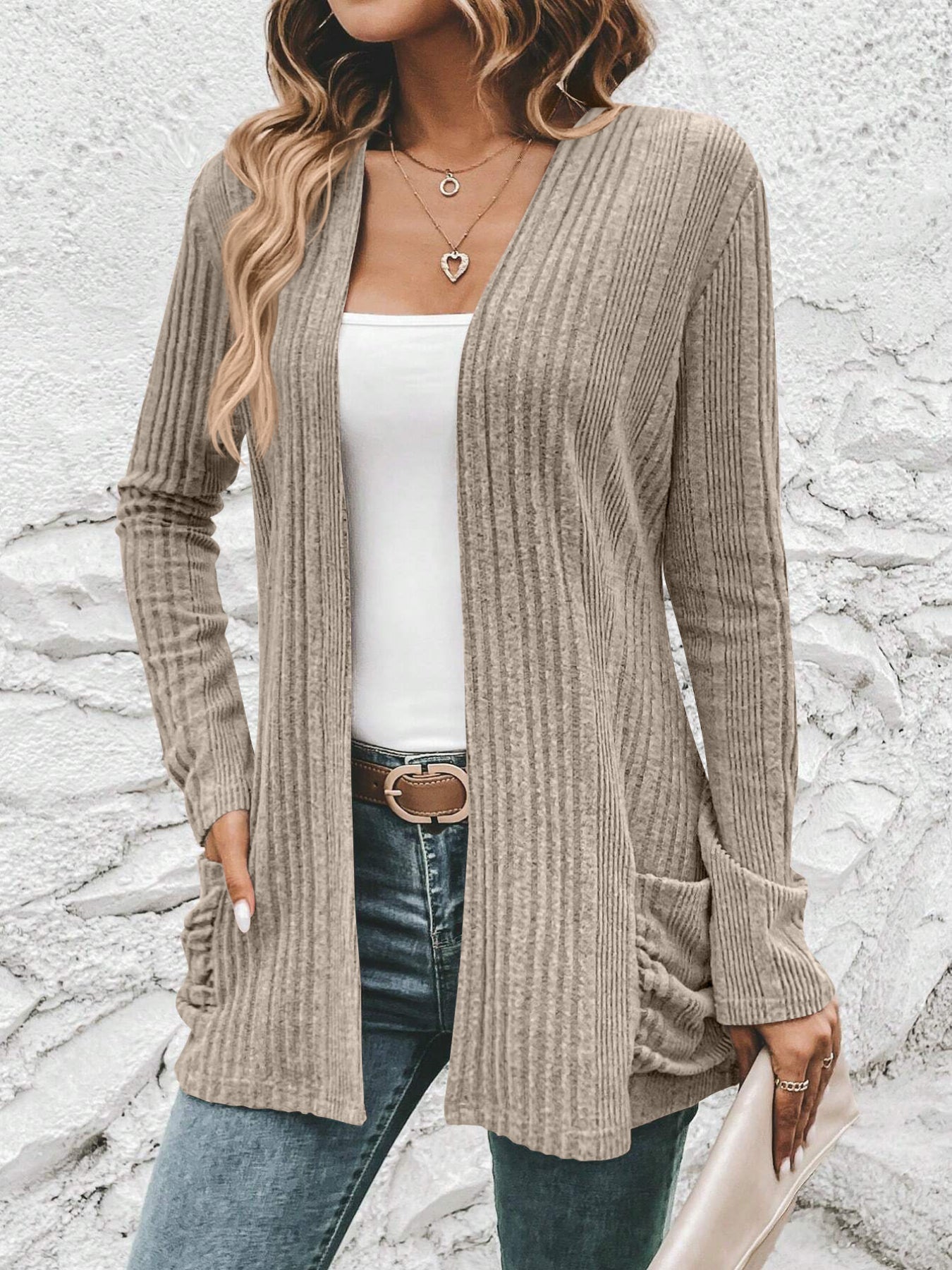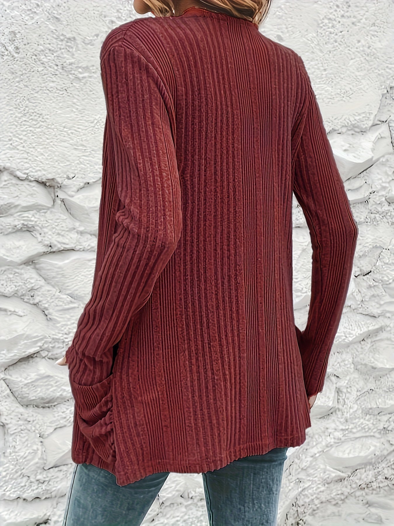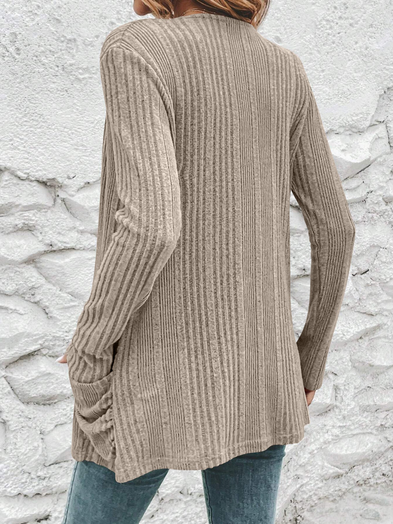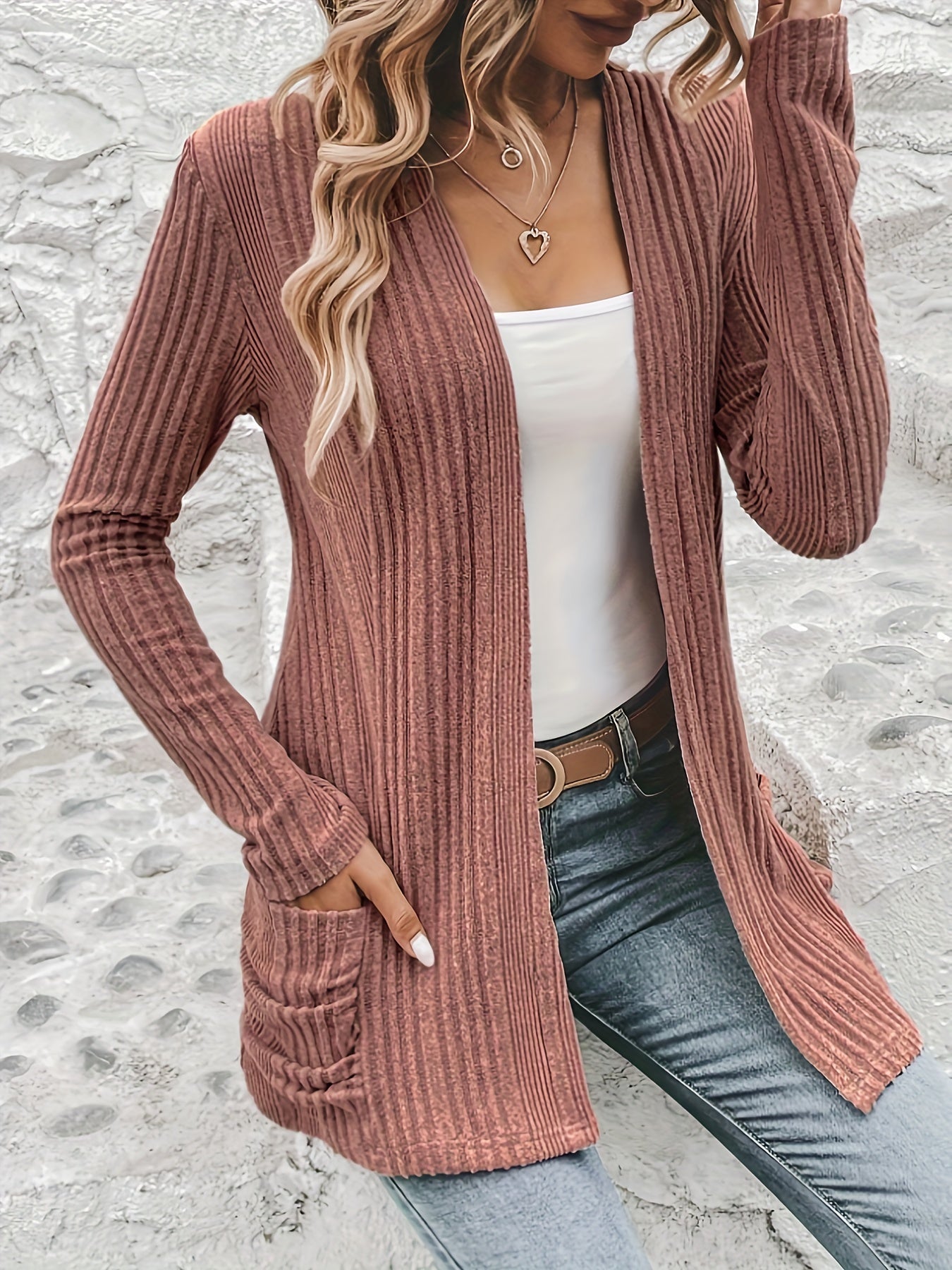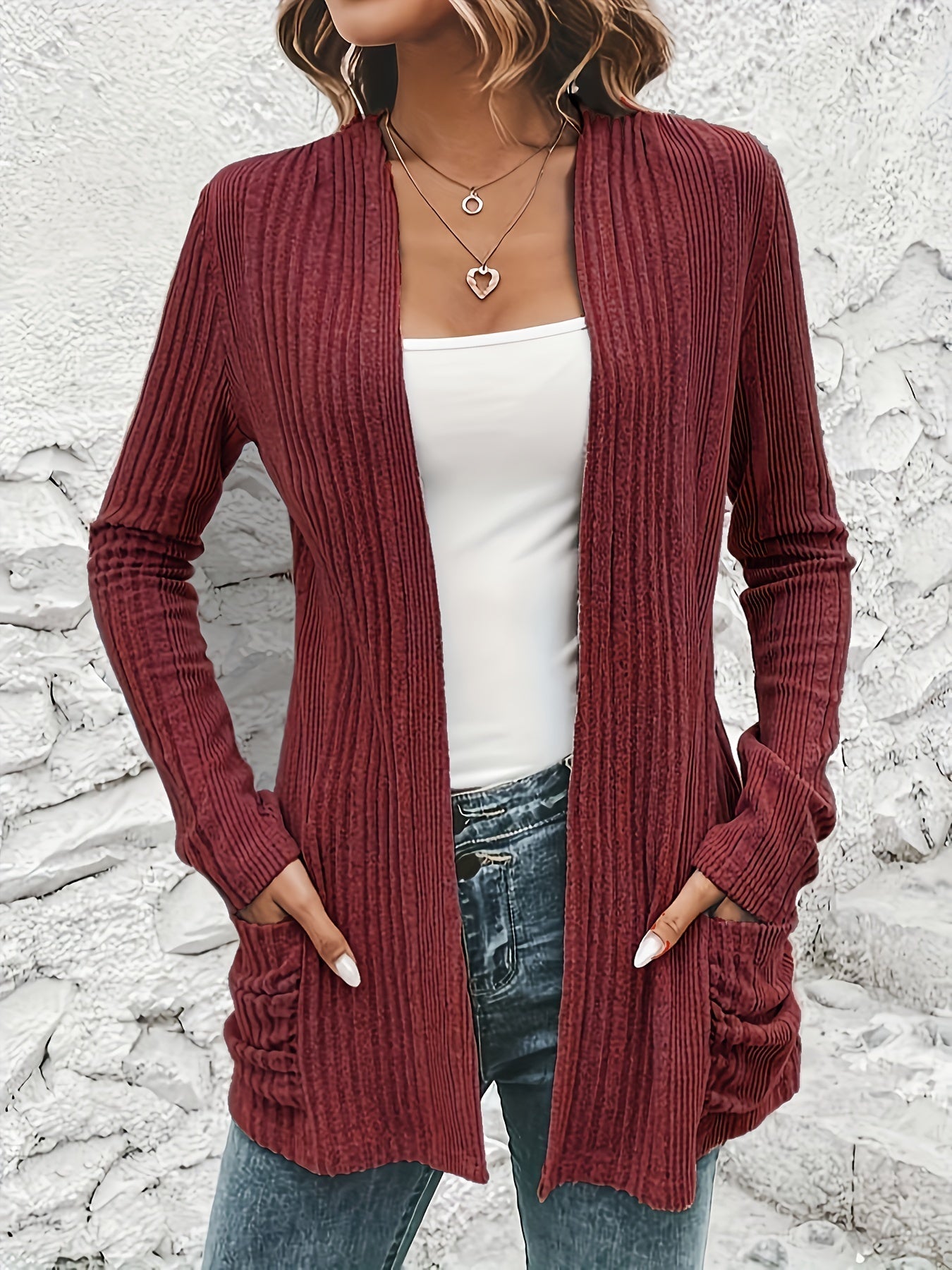Solid Open Front Rib Knit Cardigan, Casual Long Sleeve Slim Cardigan With Pocket