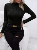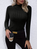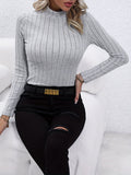 Solid Ribbed Mock Neck Pullover Sweater, Elegant Long Sleeve Sweater