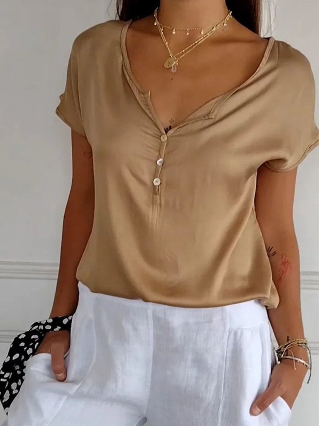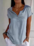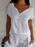Solid Short Sleeve Buttoned V Neck T-Shirt