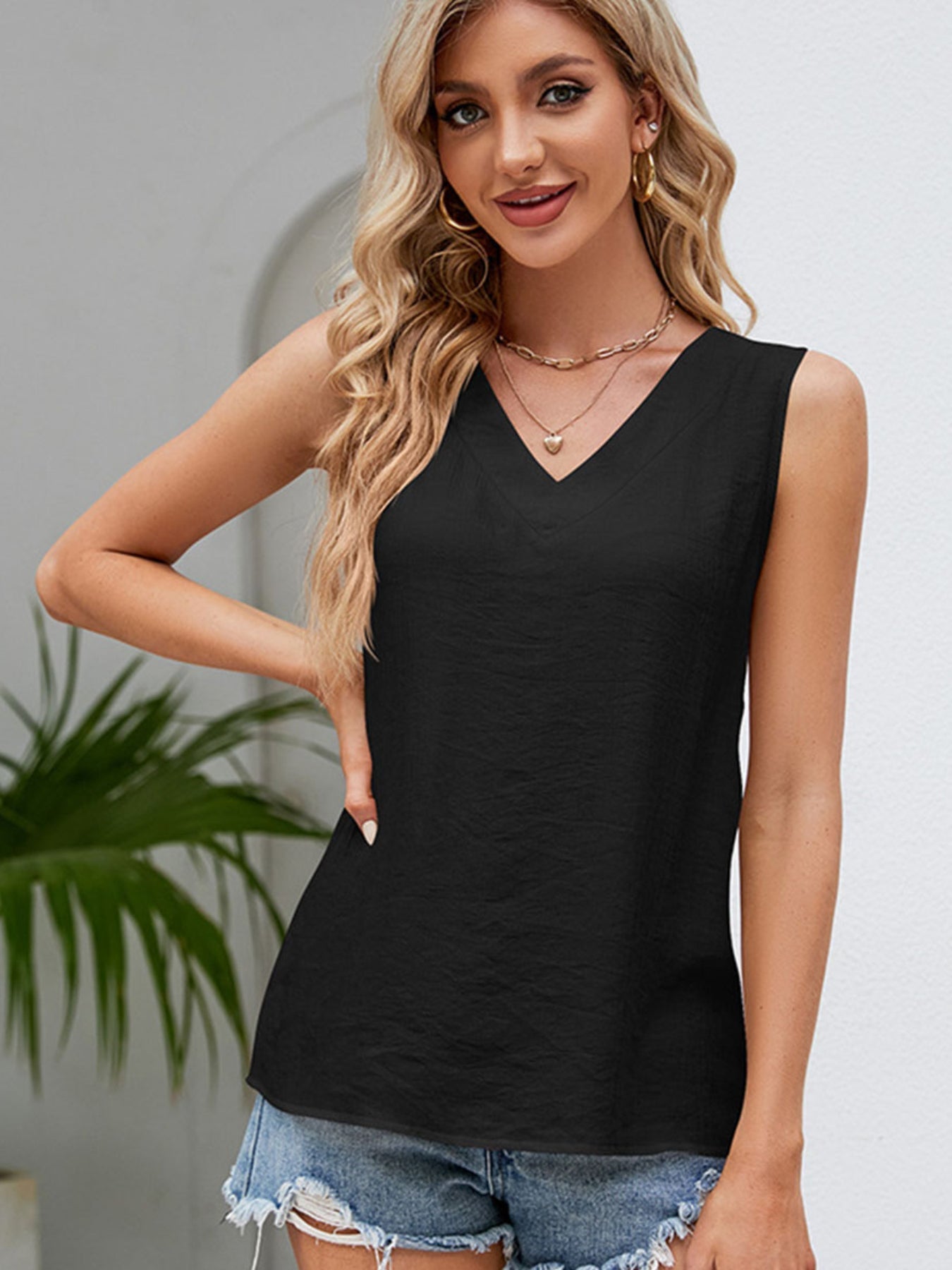 Sale Plain Daily Casual Sleeveless V Neck Regular Tank Top