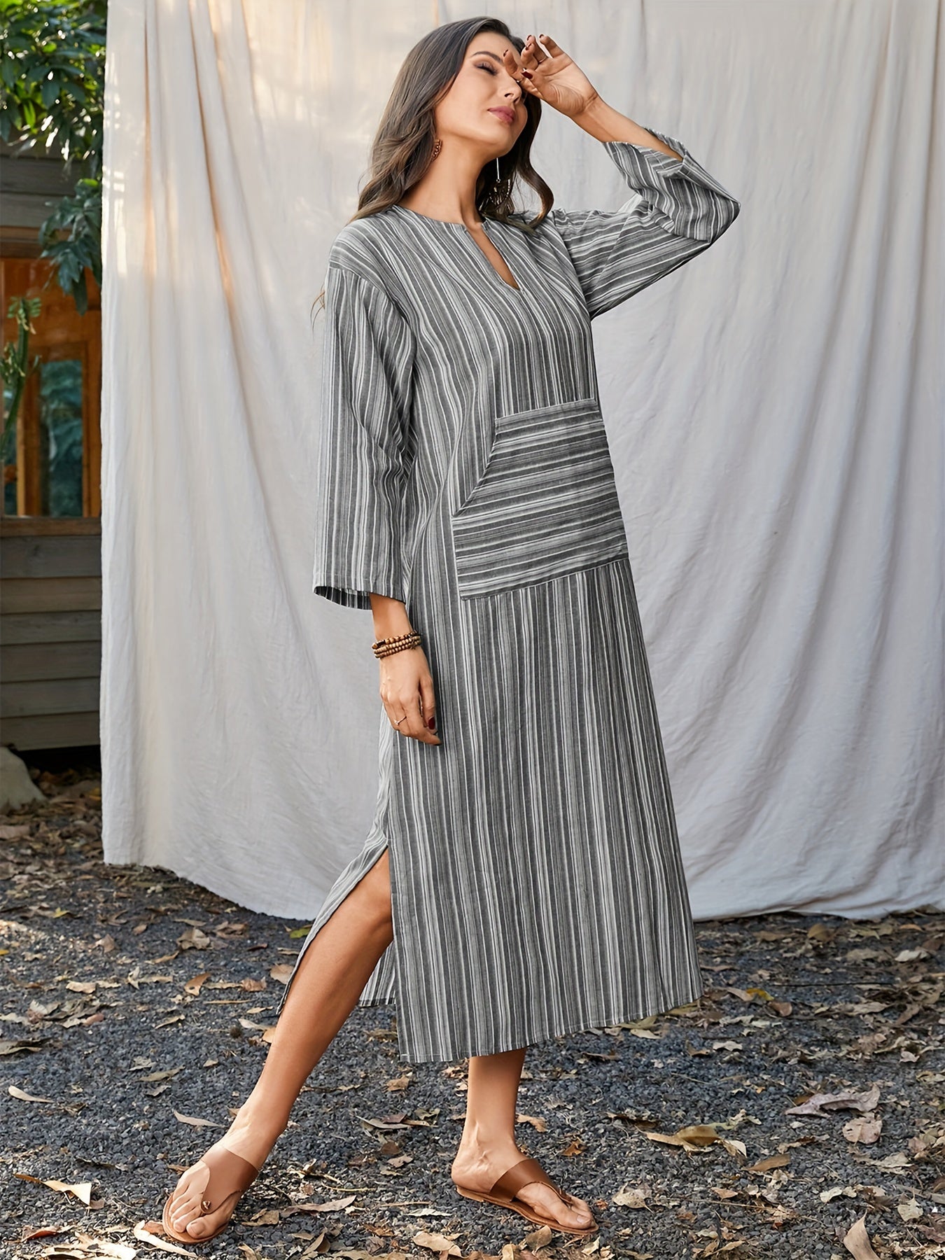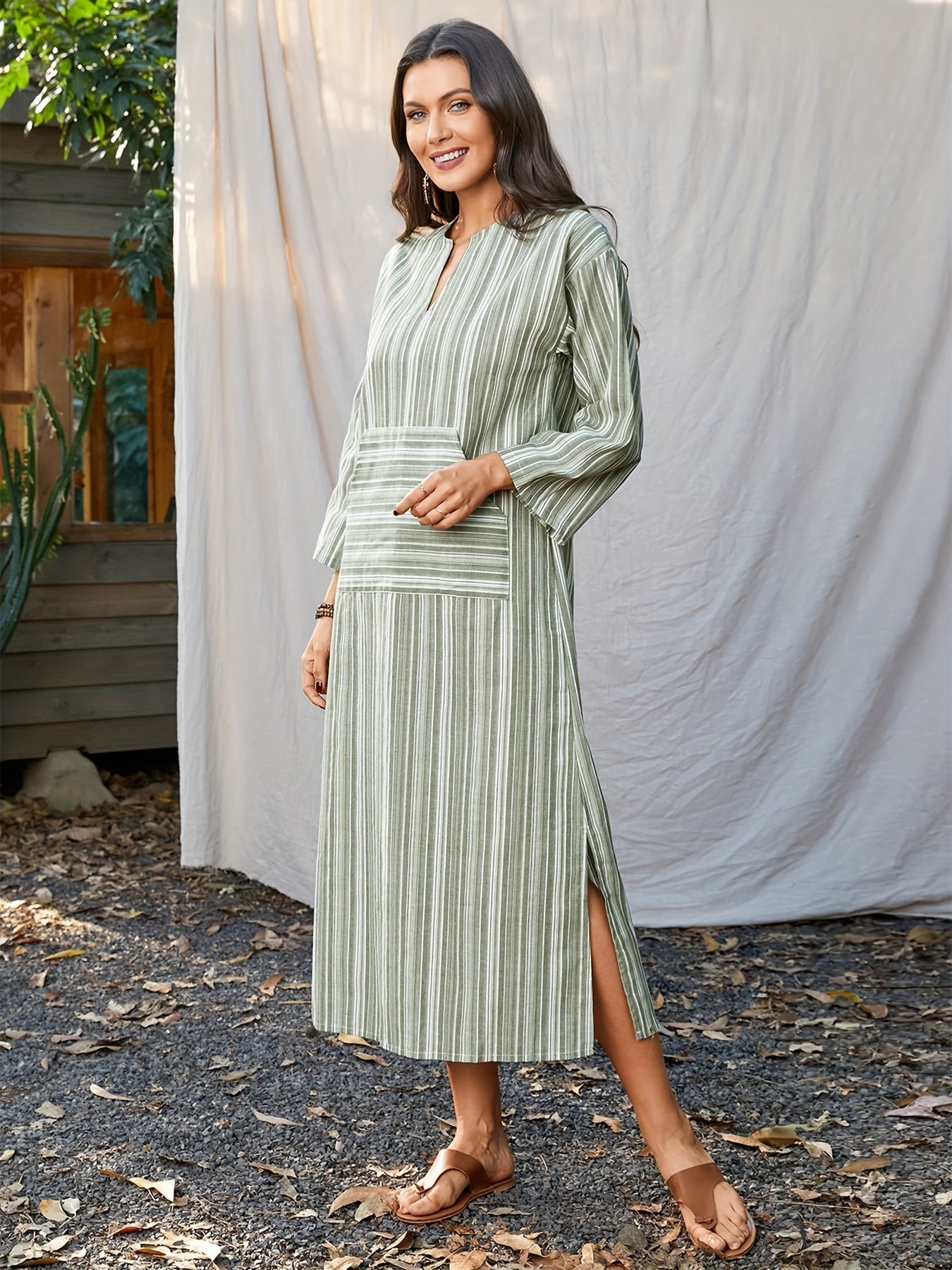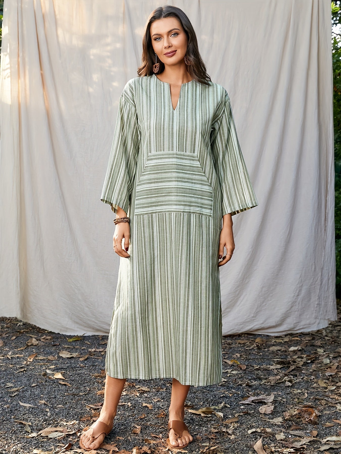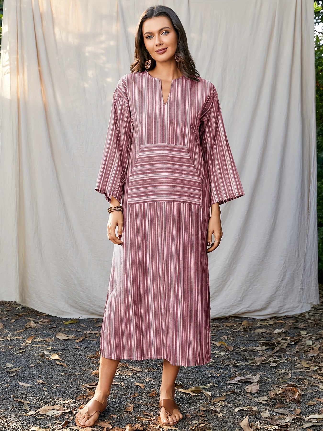Striped Print Long Sleeve Dress - Relaxed Casual Style with Notch Neck