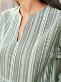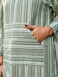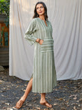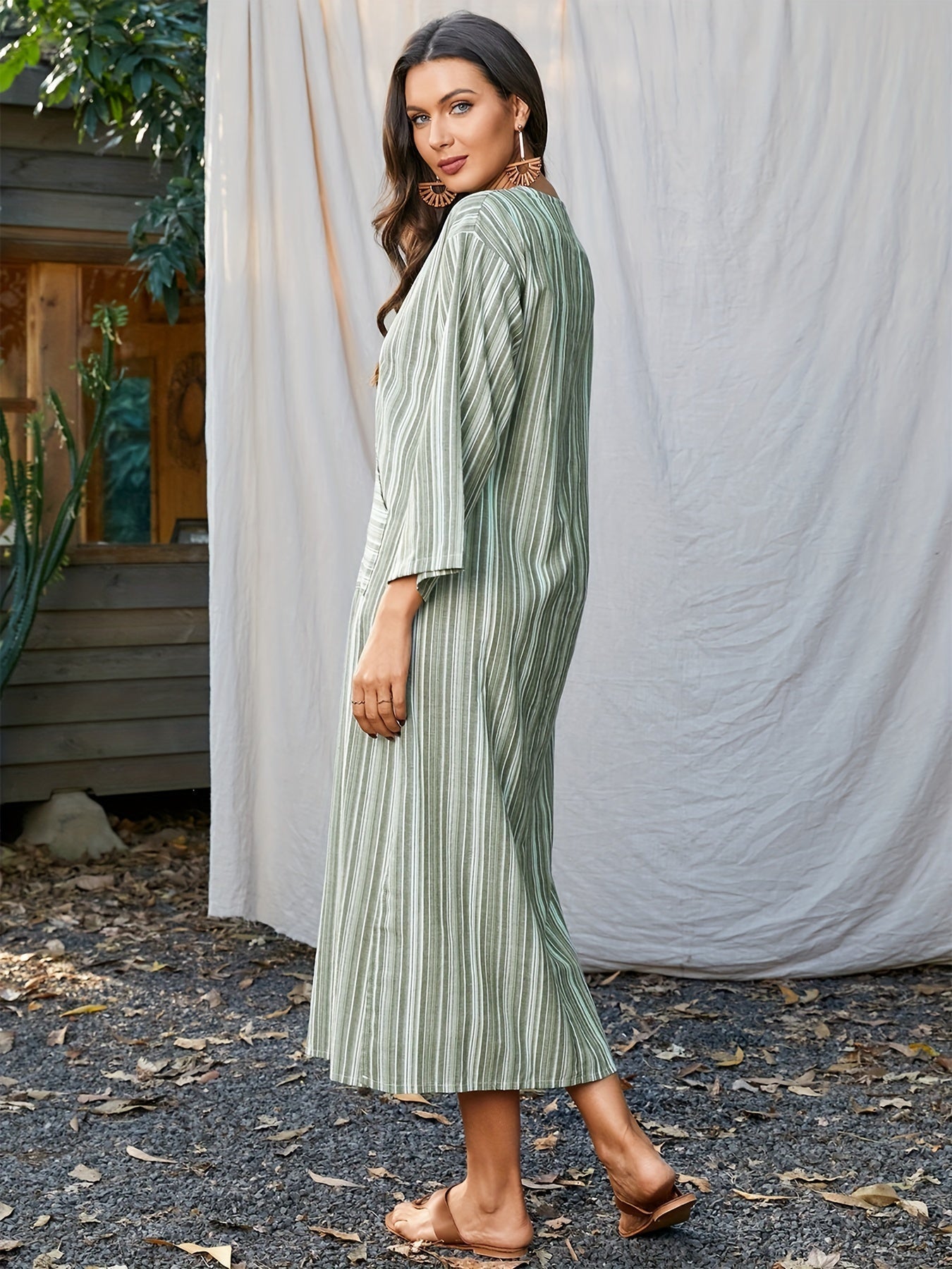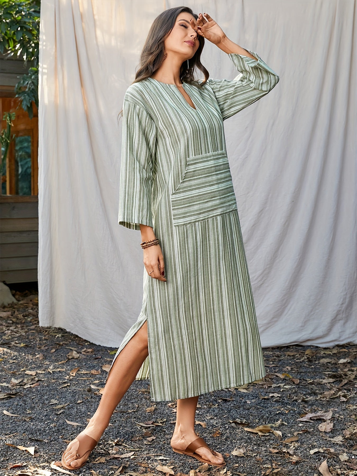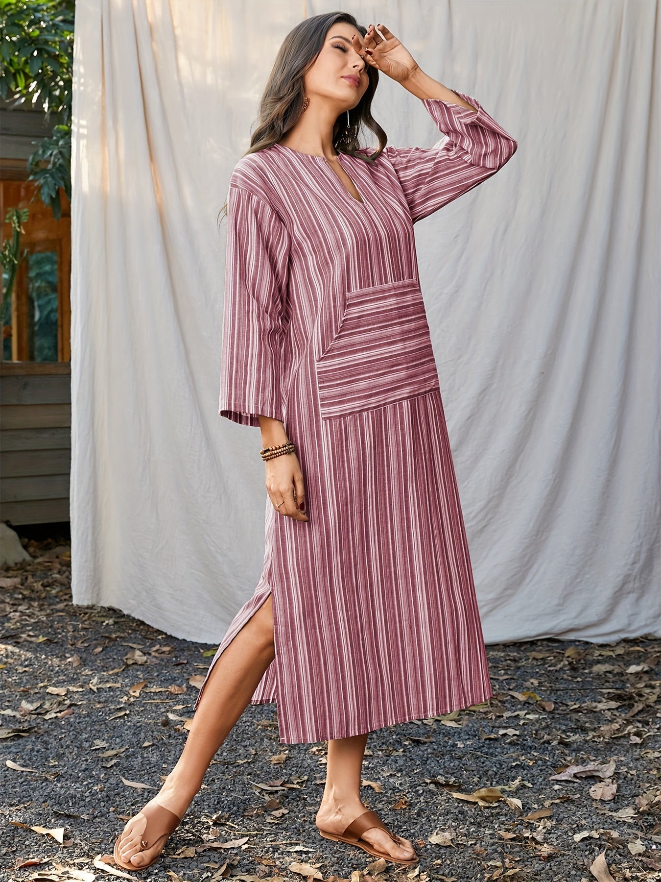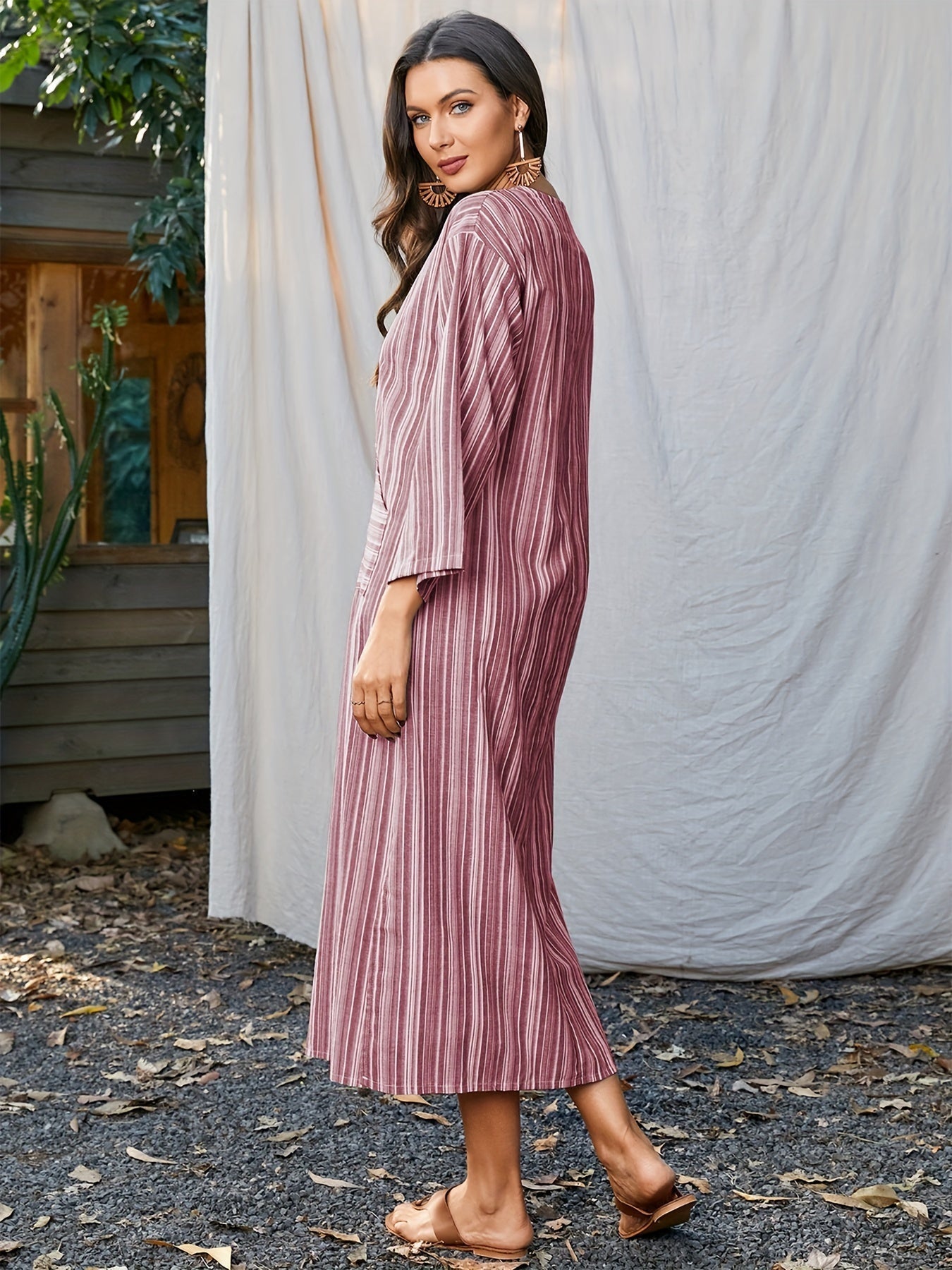 Striped Print Long Sleeve Dress - Relaxed Casual Style with Notch Neck