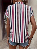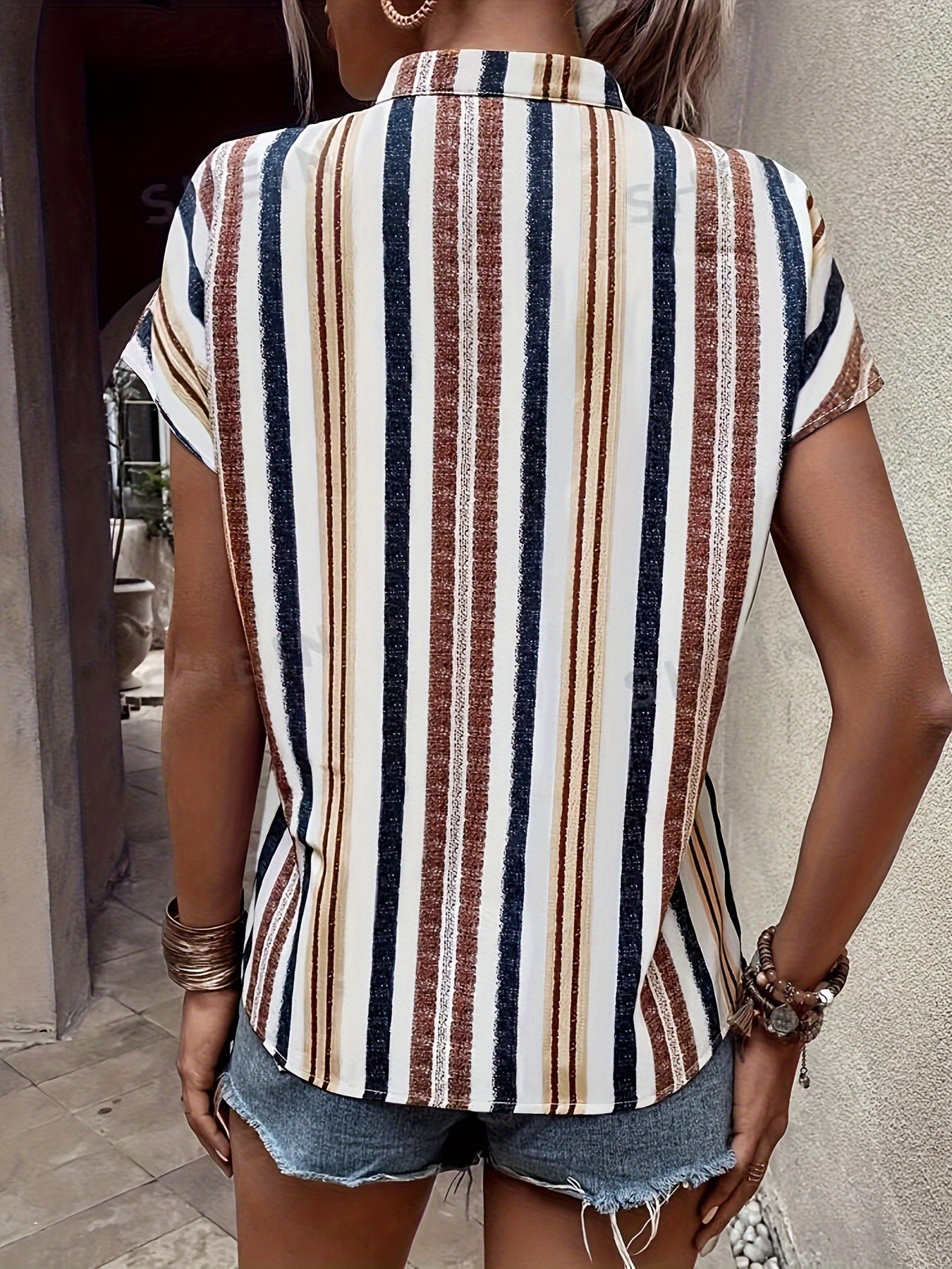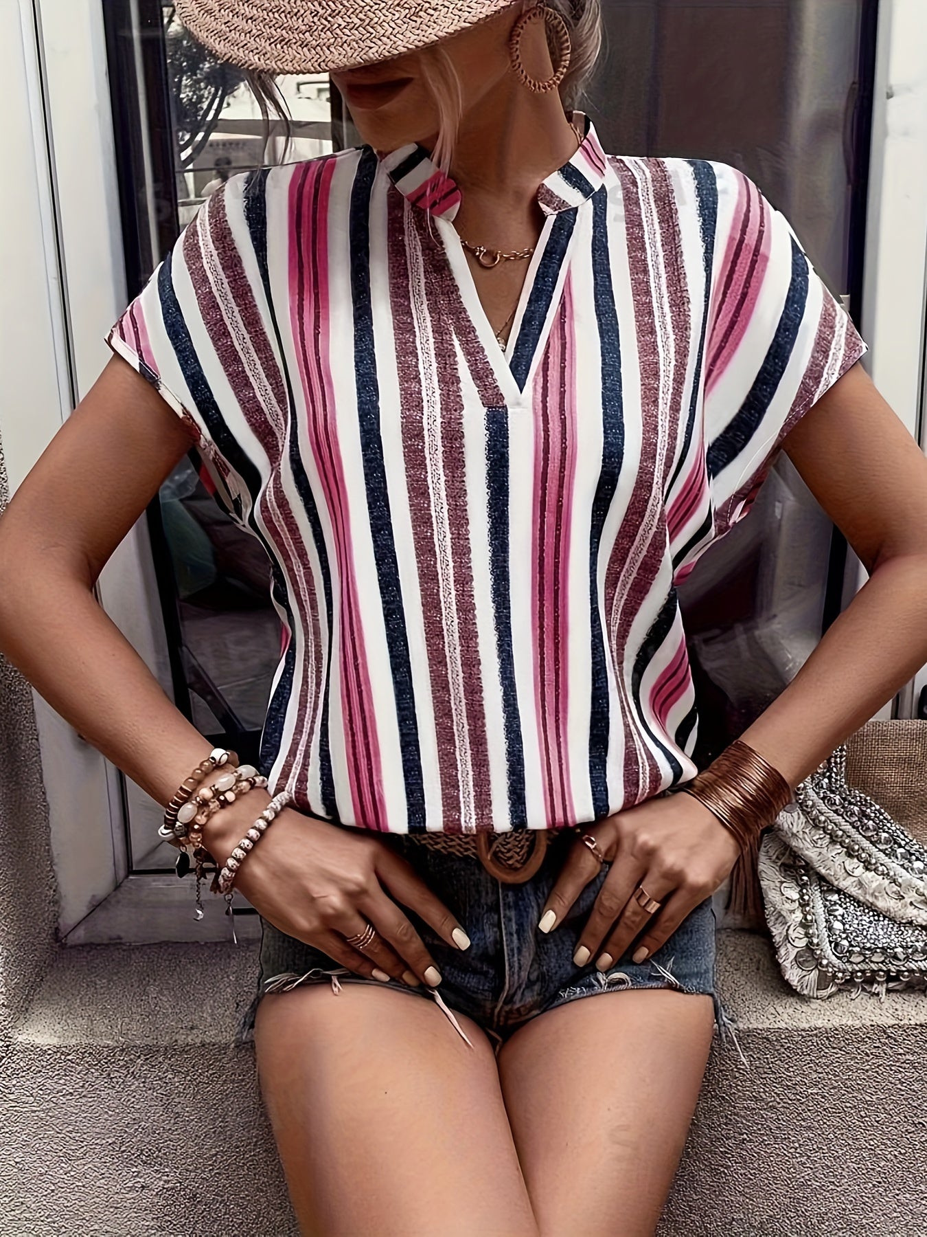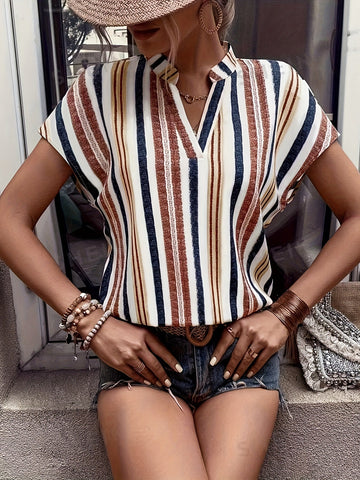 Striped Print Notched Neck Blouse, Casual Short Sleeve Blouse