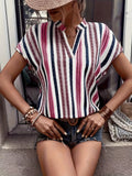 Sale Striped Print Notched Neck Blouse, Casual Short Sleeve Blouse