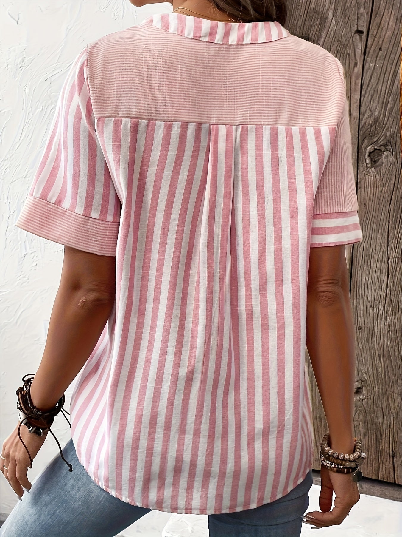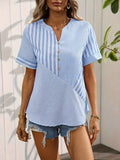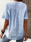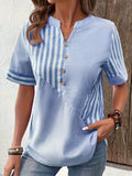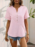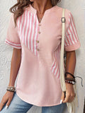 Striped Print Notched Neck Blouse, Casual Short Sleeve Button Front Blouse