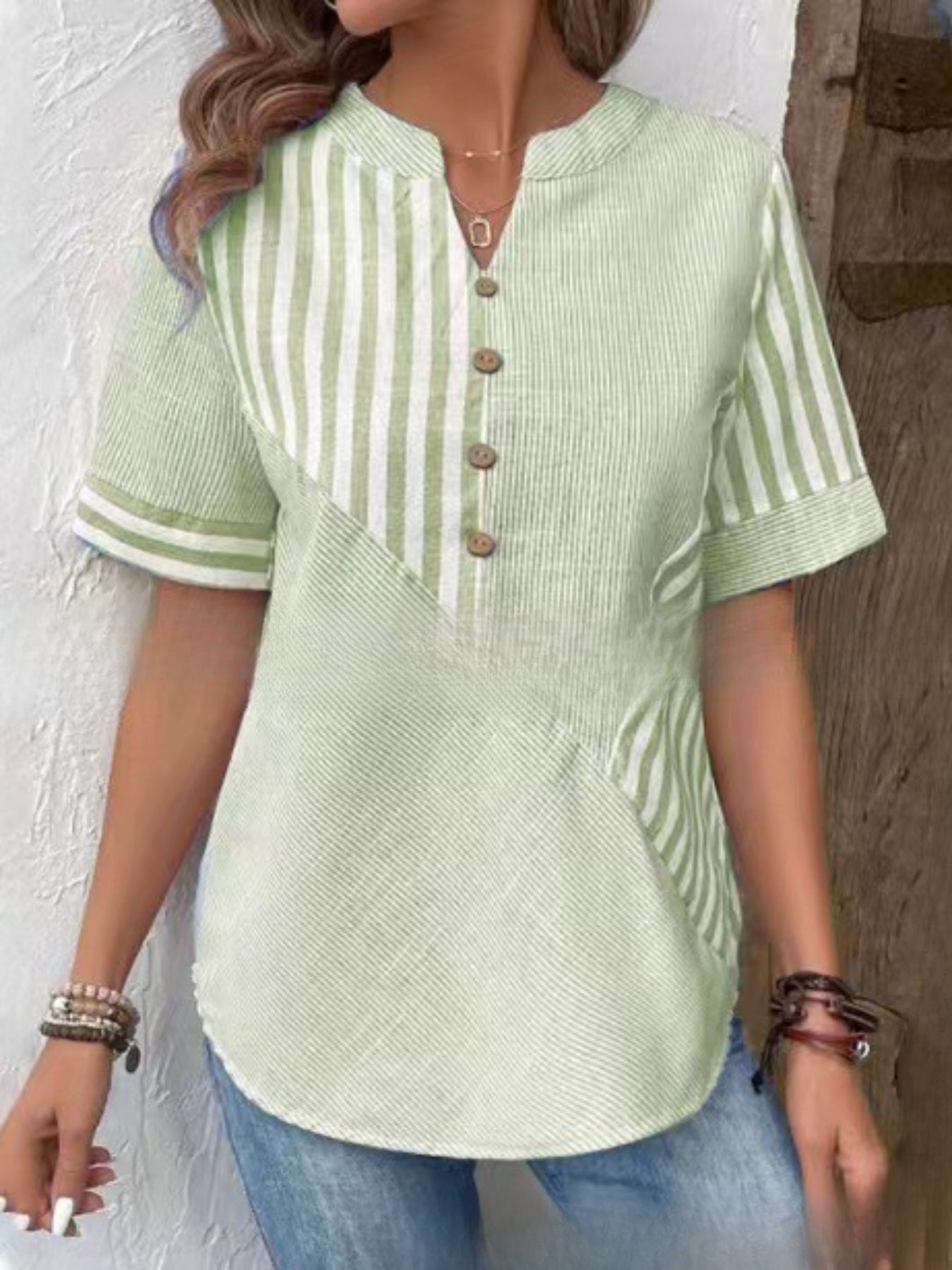 Sale Striped Print Notched Neck Blouse, Casual Short Sleeve Button Front Blouse