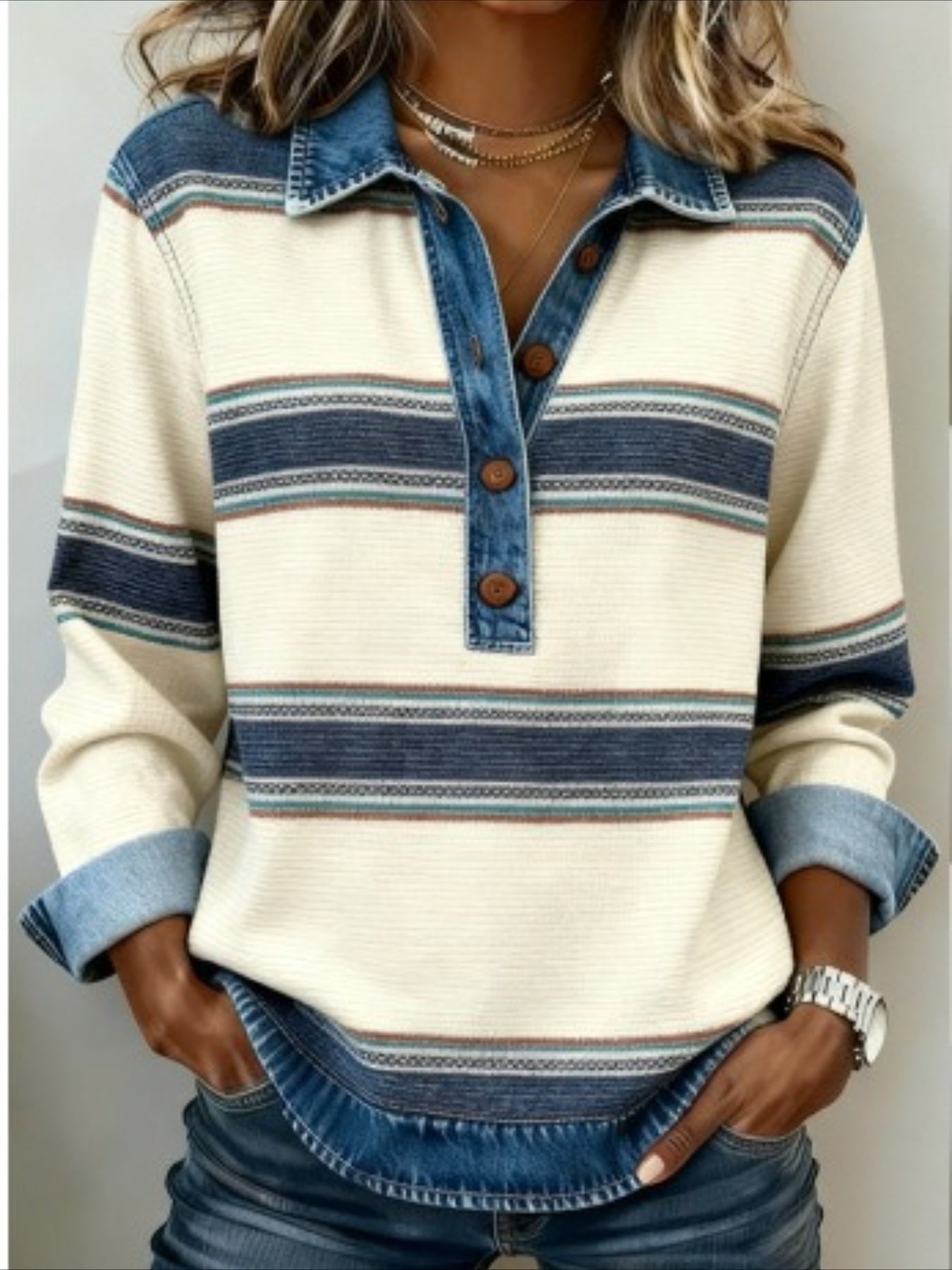 Striped Printed Twist College Style Denim Splicing Versatile Casual Knitted Lapel Long Sleeve Sweatshirts
