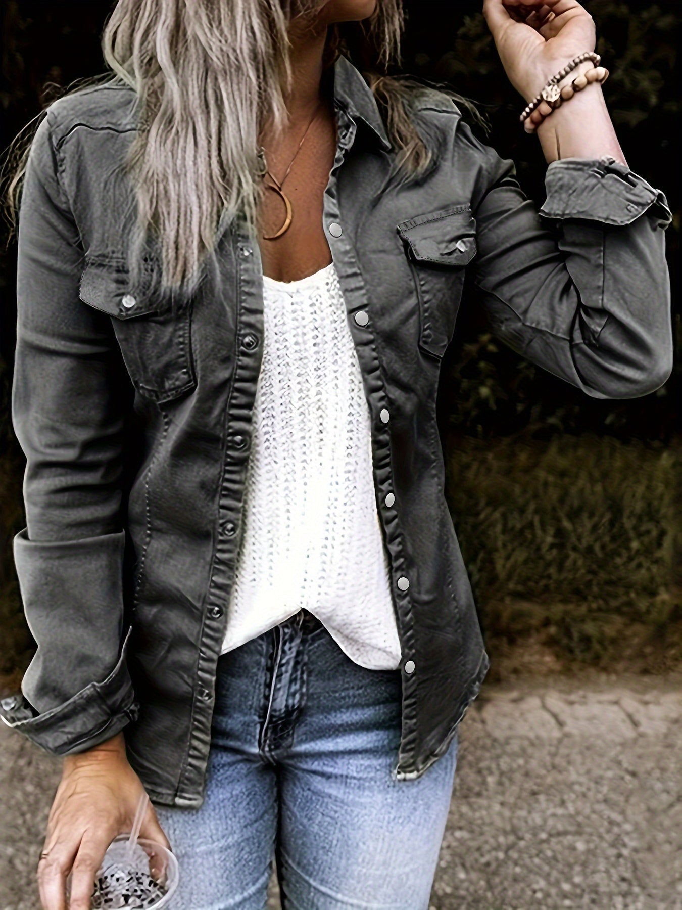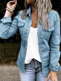 Stylish Denim Safari Top, Button Up Ruched Trim Long Sleeve Collared Shirt, Casual Light Jacket Tops