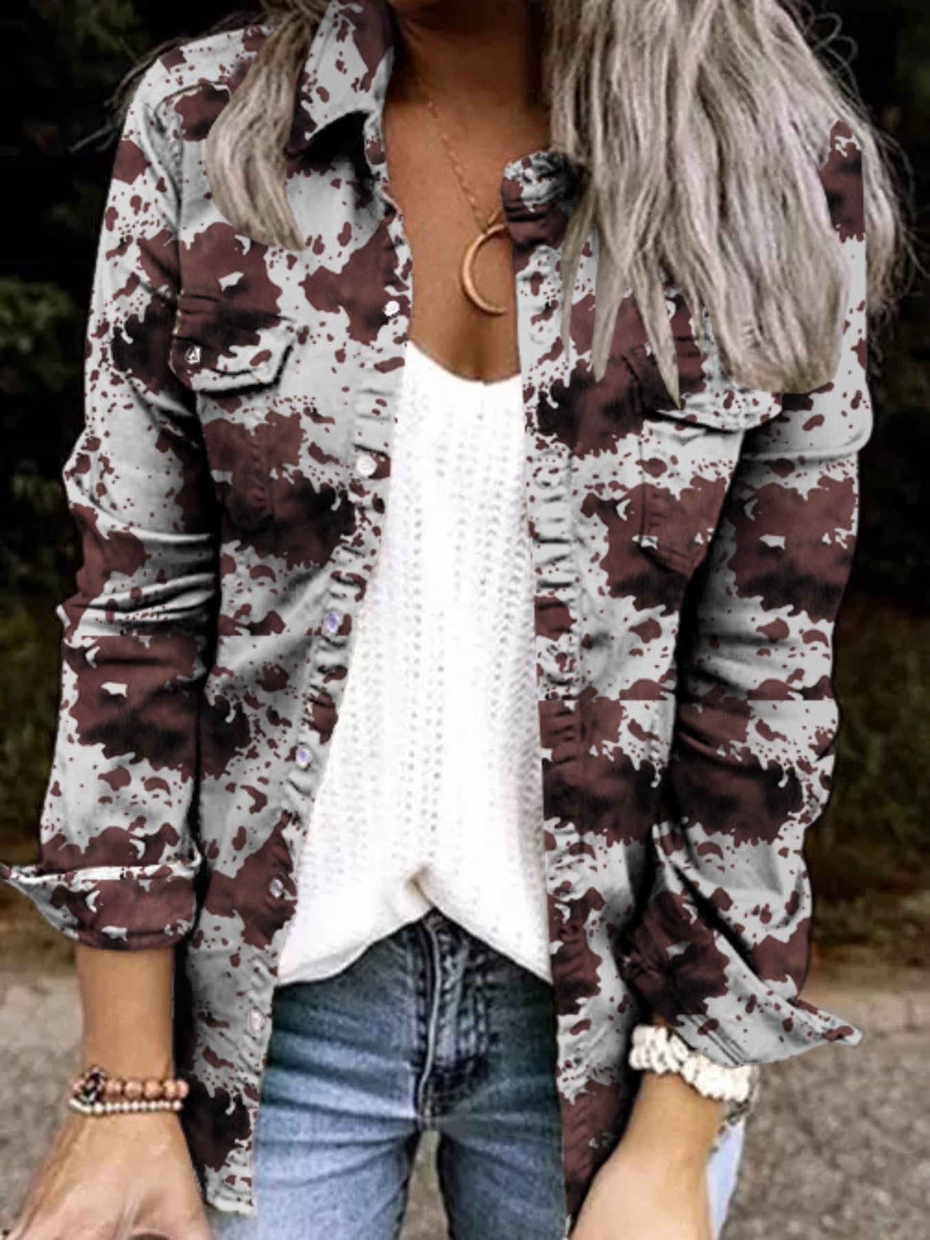Sale Button Geometric Print Long Sleeve T Shirt
