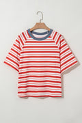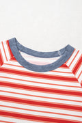 Tomato Red Stripe Print Contrast Collar Raglan Sleeve T Shirt