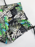 Sale 3-Piece Leaf Plant Print Bikini Sets, Triangle Halter Neck High Cut With Sheer Cover Up Drawstring Overall Swimsuit