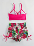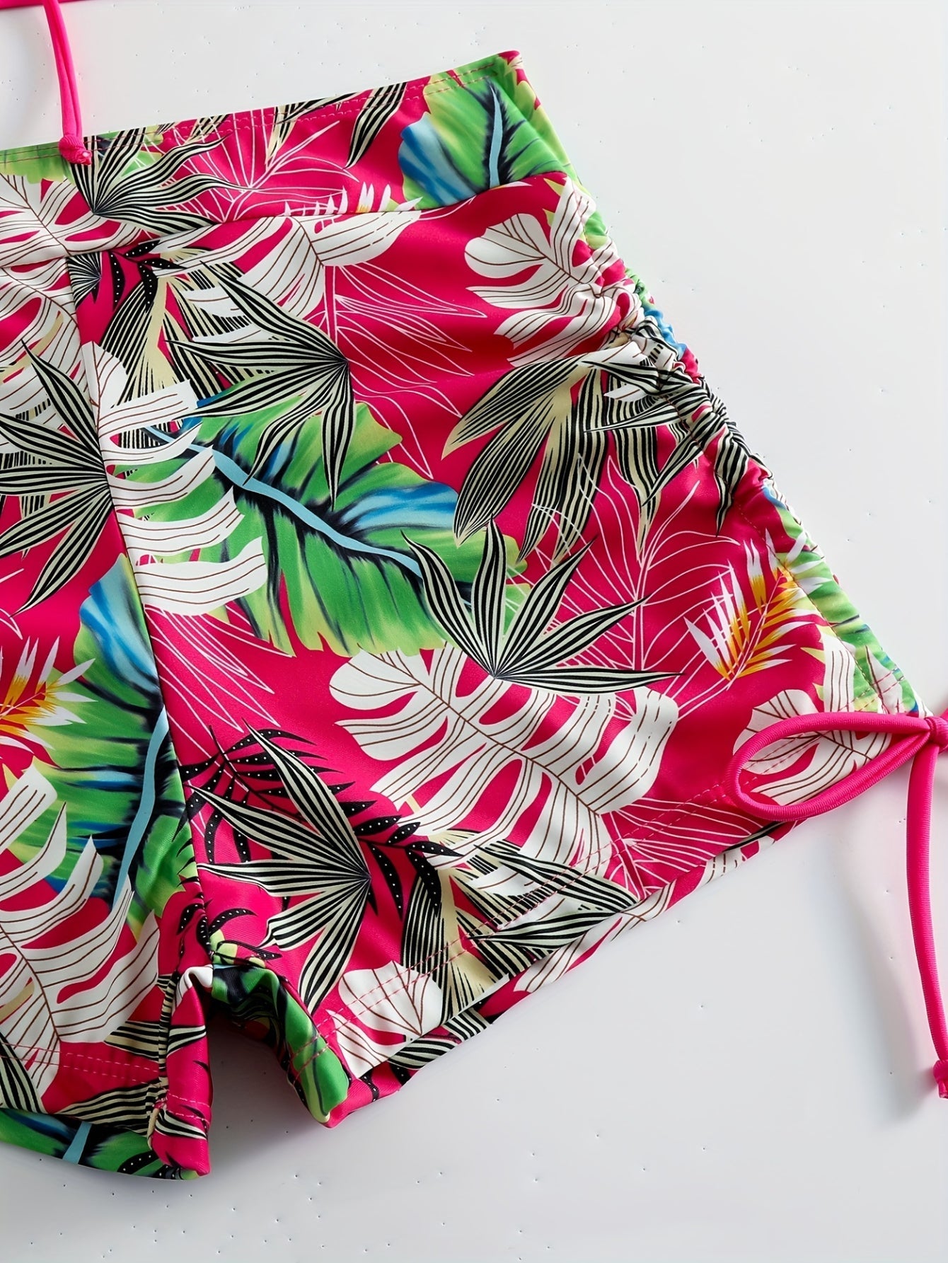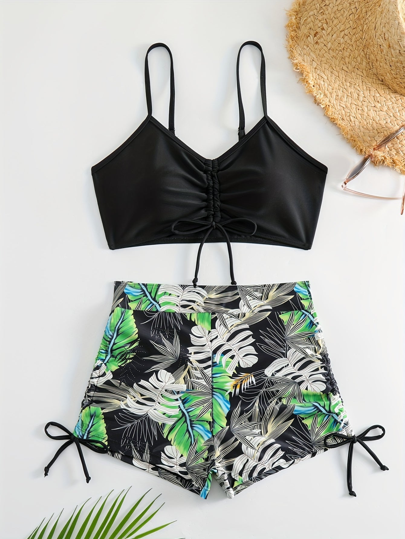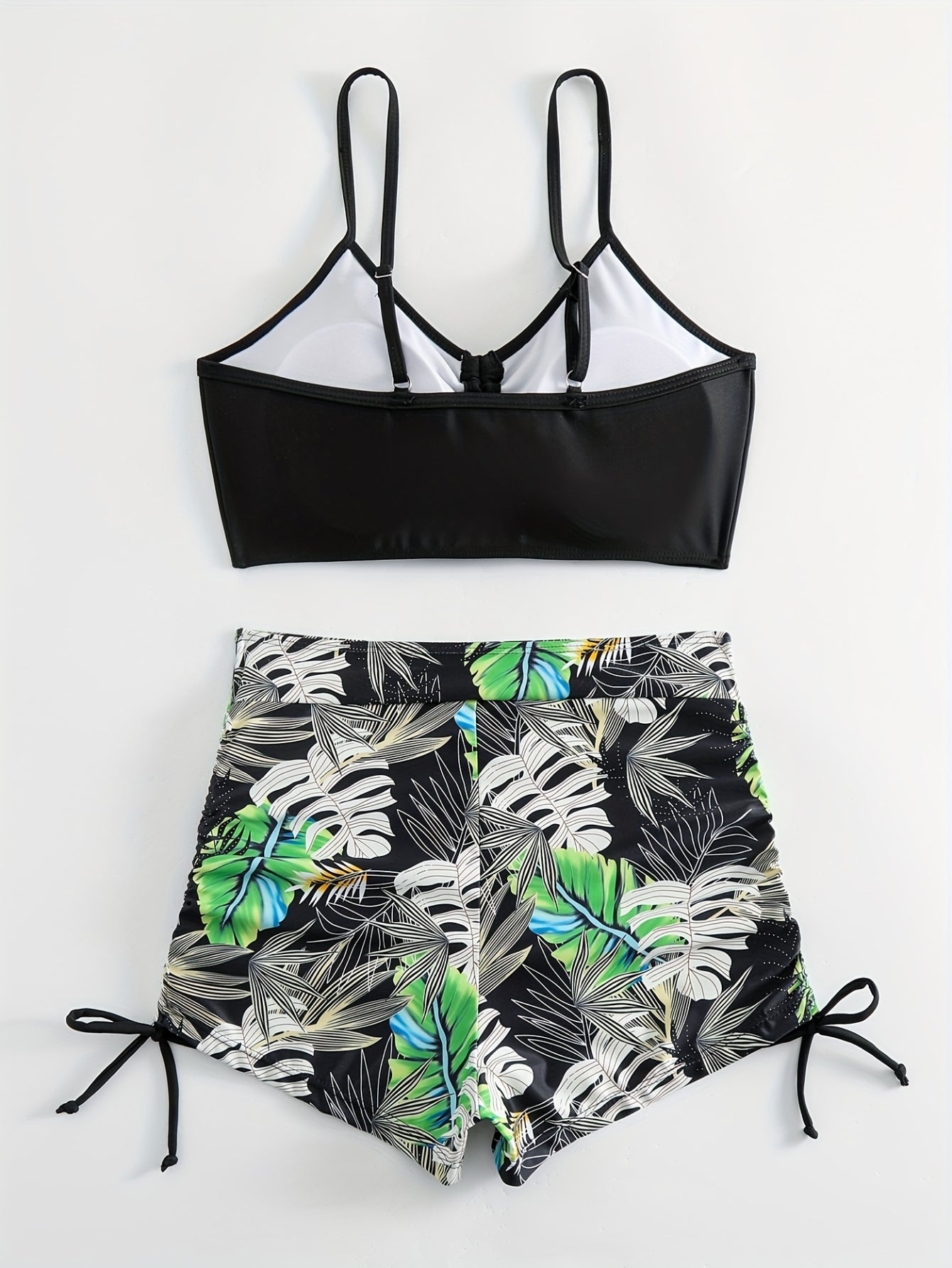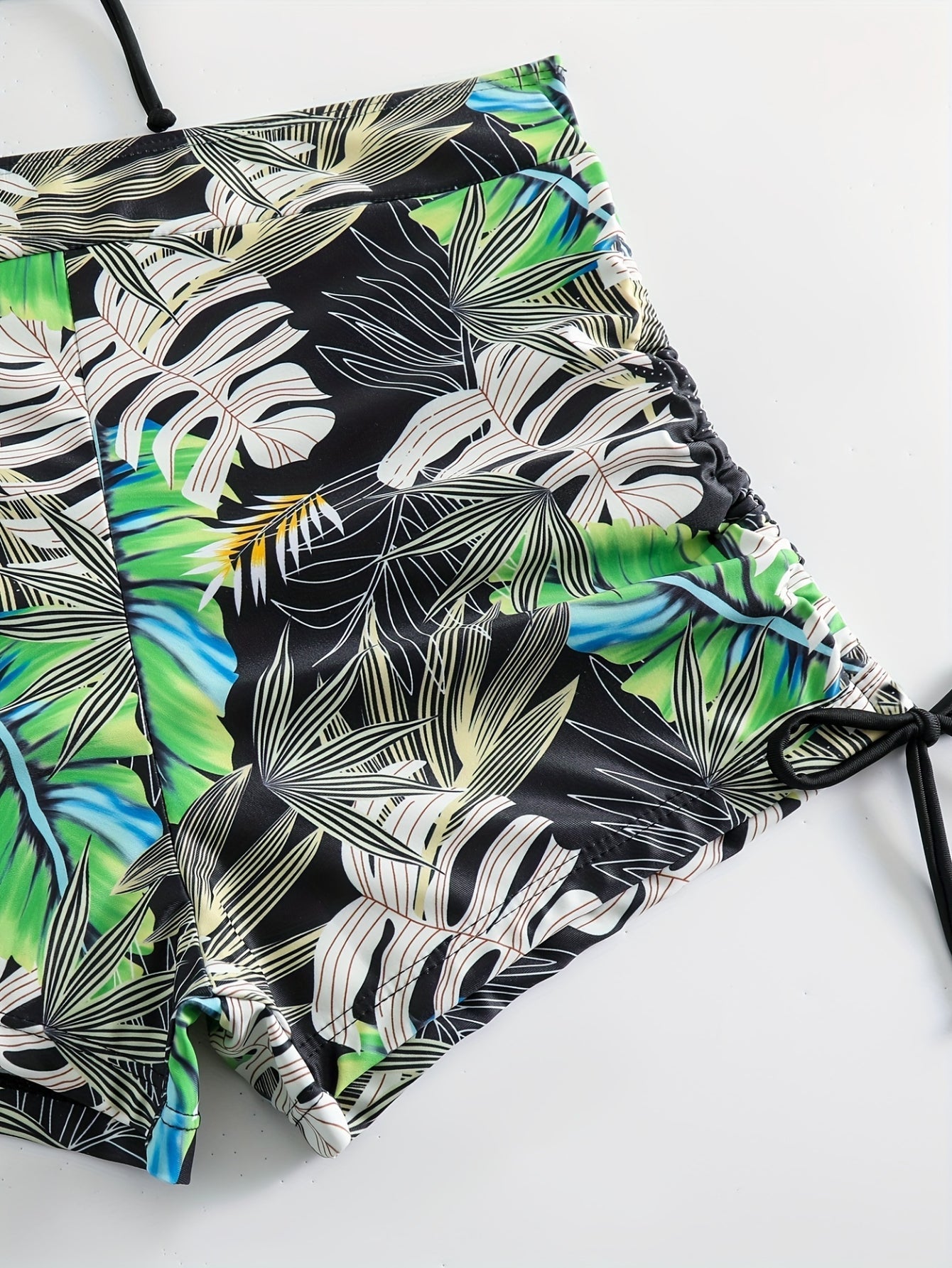Tropical Leaf Print V Neck High Waist Bikini Sets, Drawstring Spaghetti Straps Boxer Short Bottoms Two Pieces Swimsuit