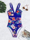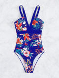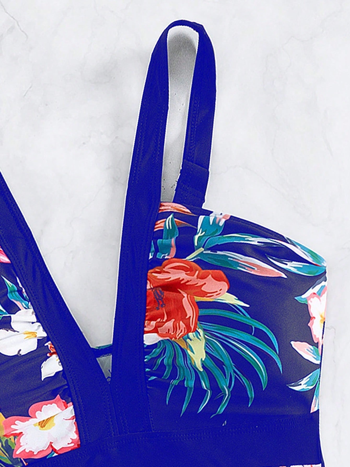 Sale Pink Floral Ruffle Trim V Neck Lace-up Back Tummy Control One Piece Swimsuit