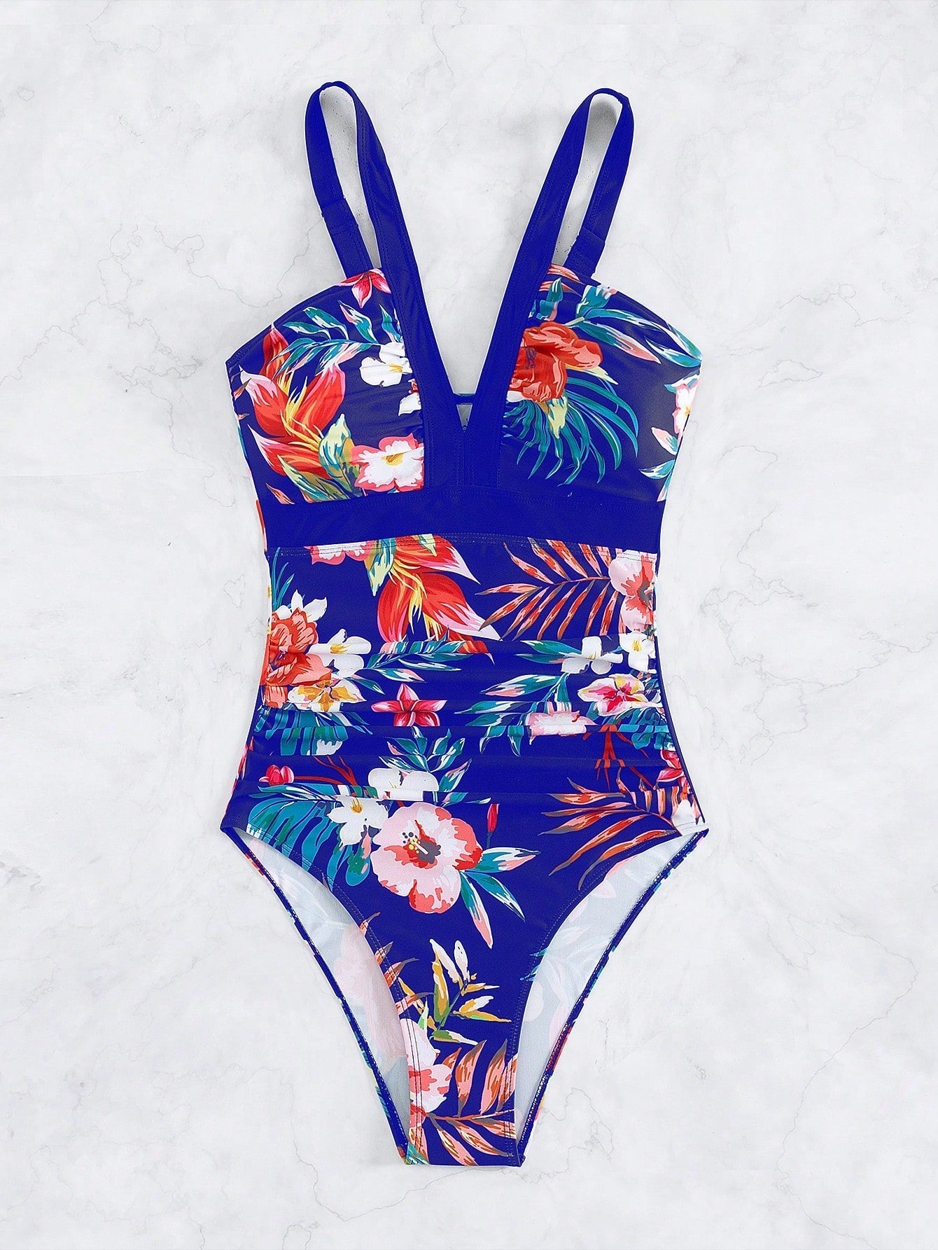 Sale Solid Mesh Contrast One-piece Swimsuit, V Neck Stretchy Ruched Bathing Suits