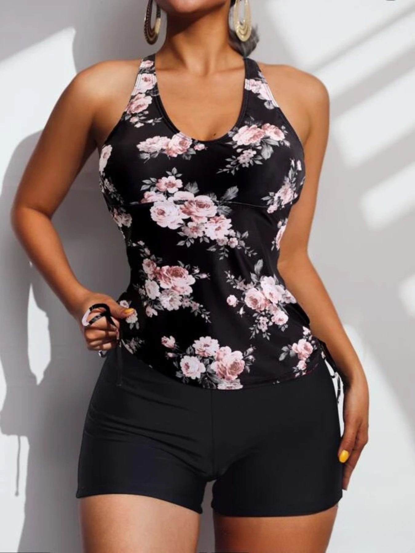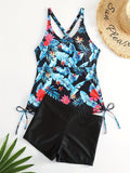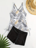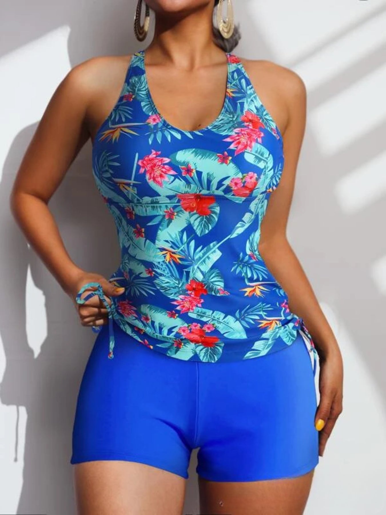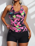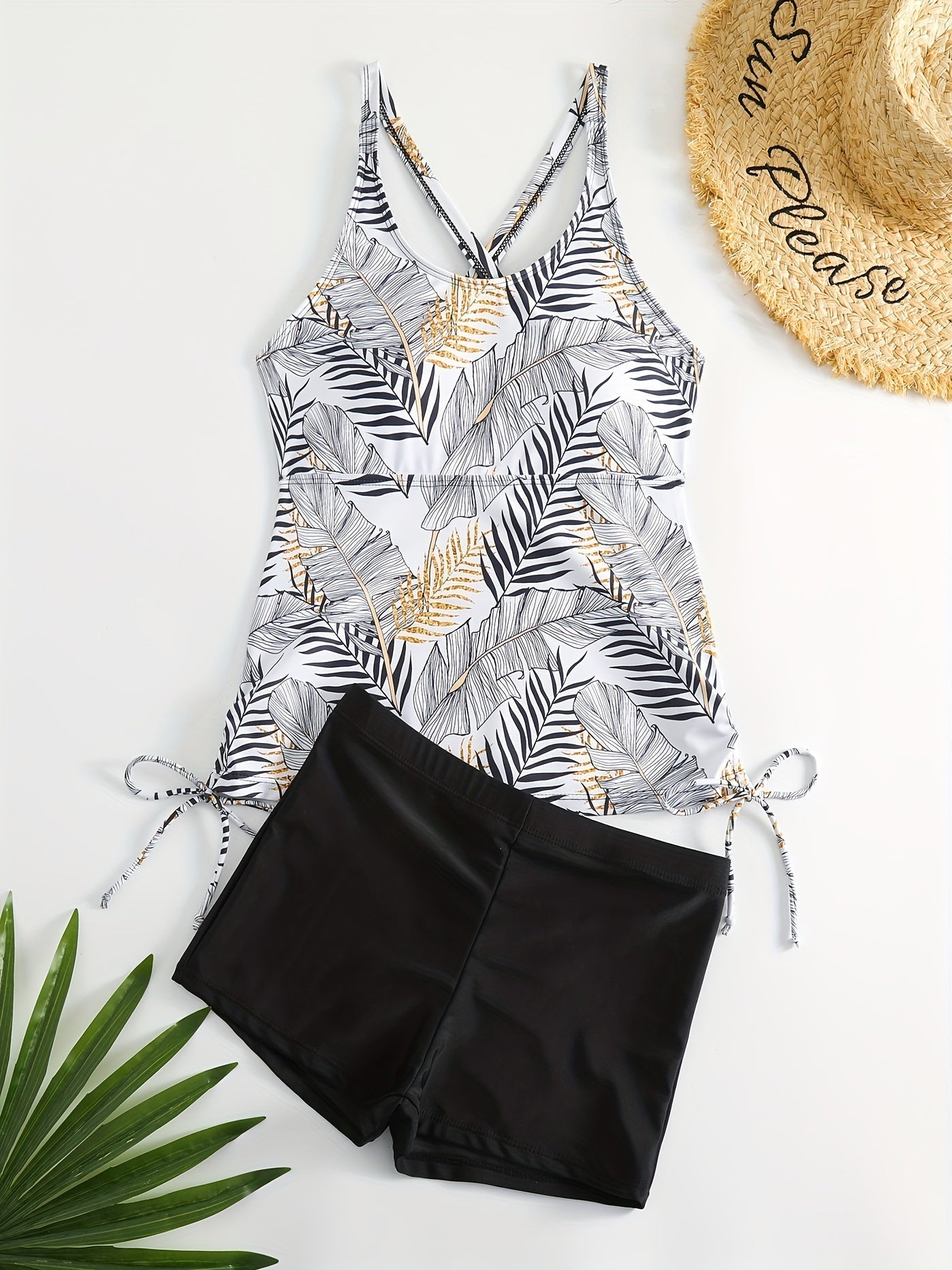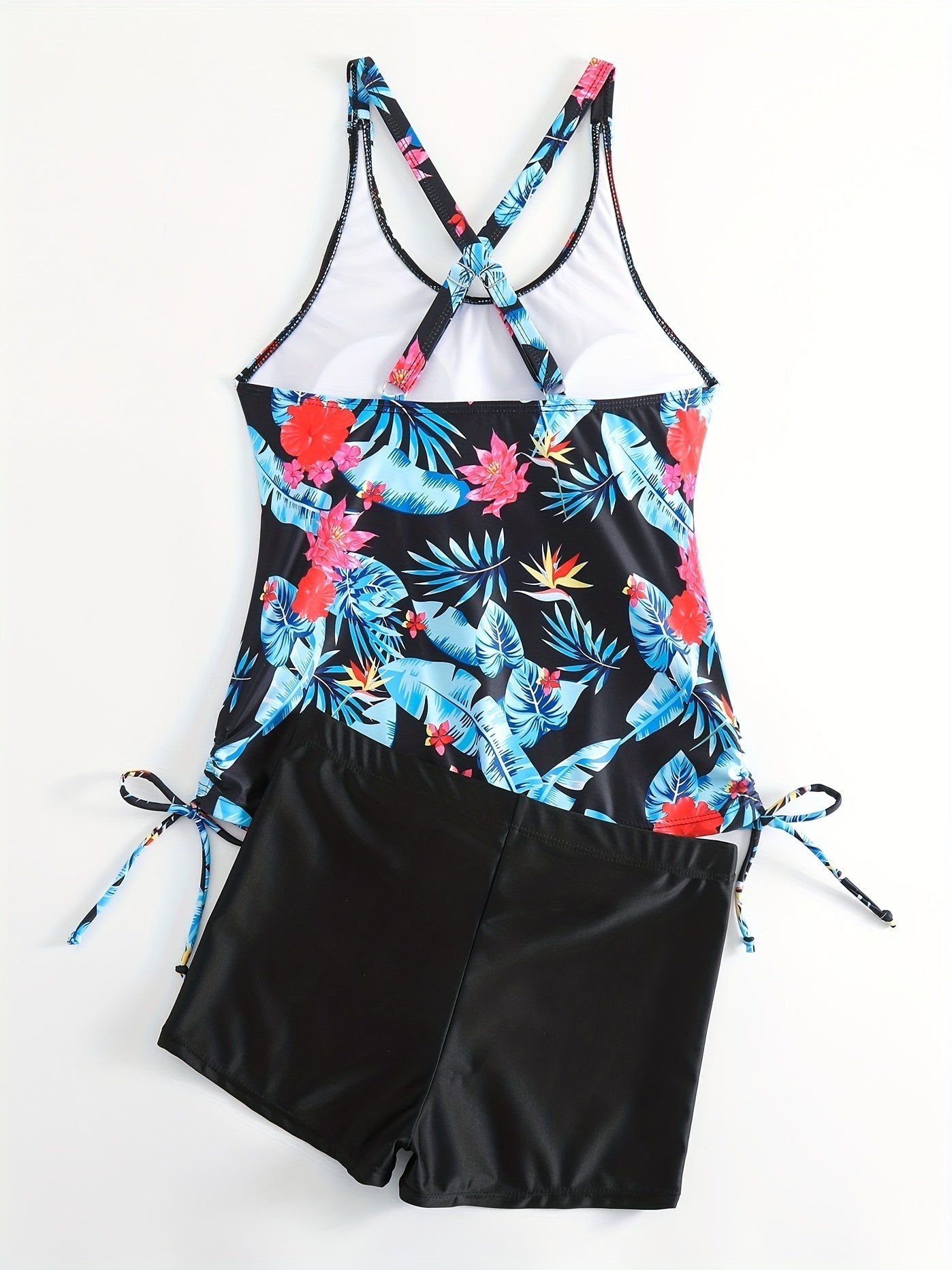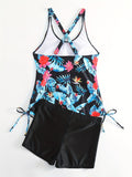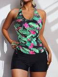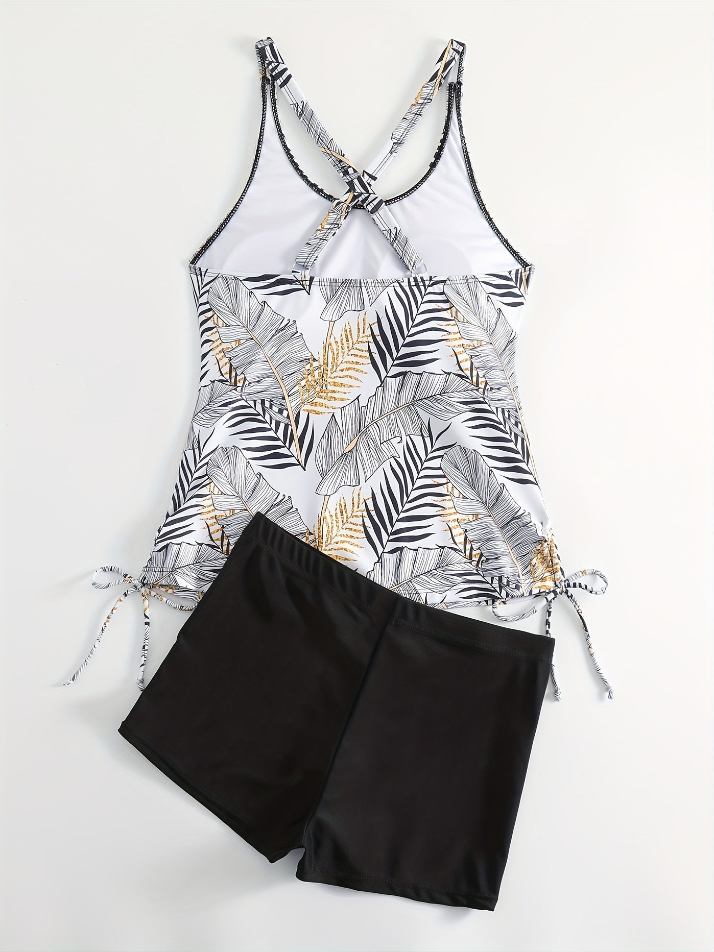 Tropical Print Round Neck Tankini Sets, Drawstring Straps Boxer Short Bottom Two Pieces Swimsuit