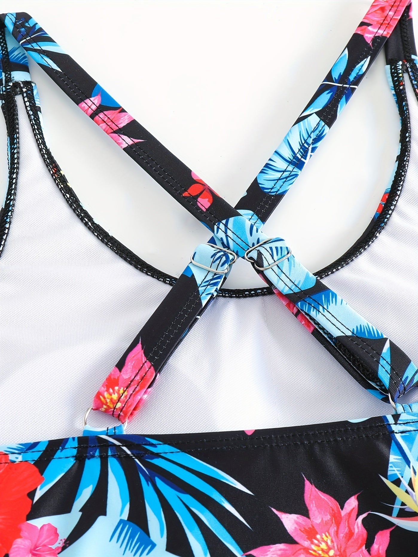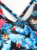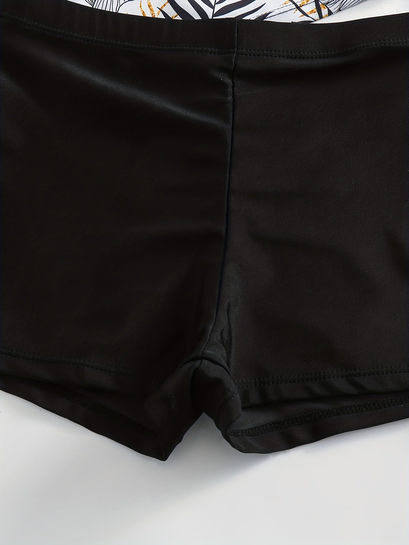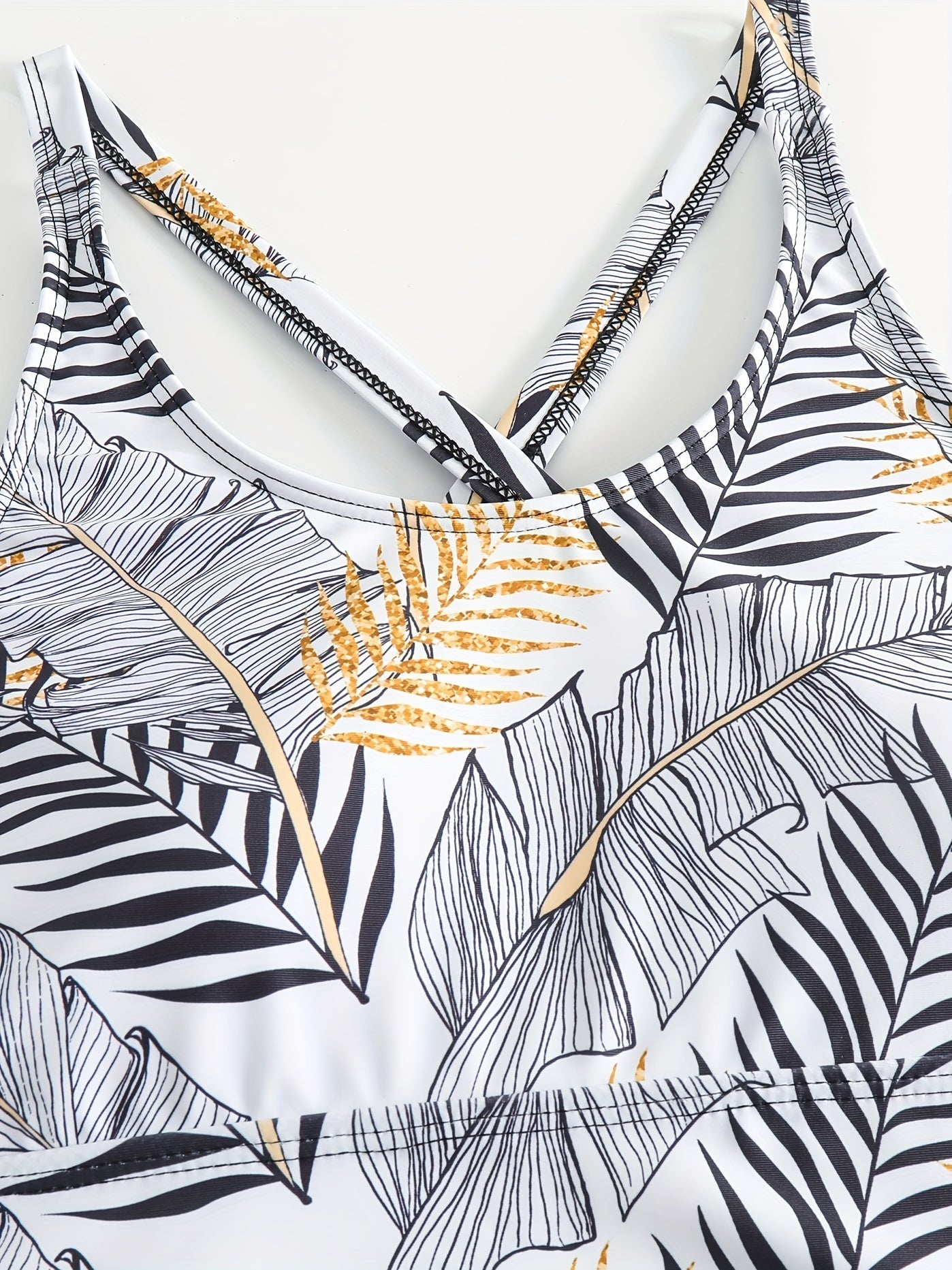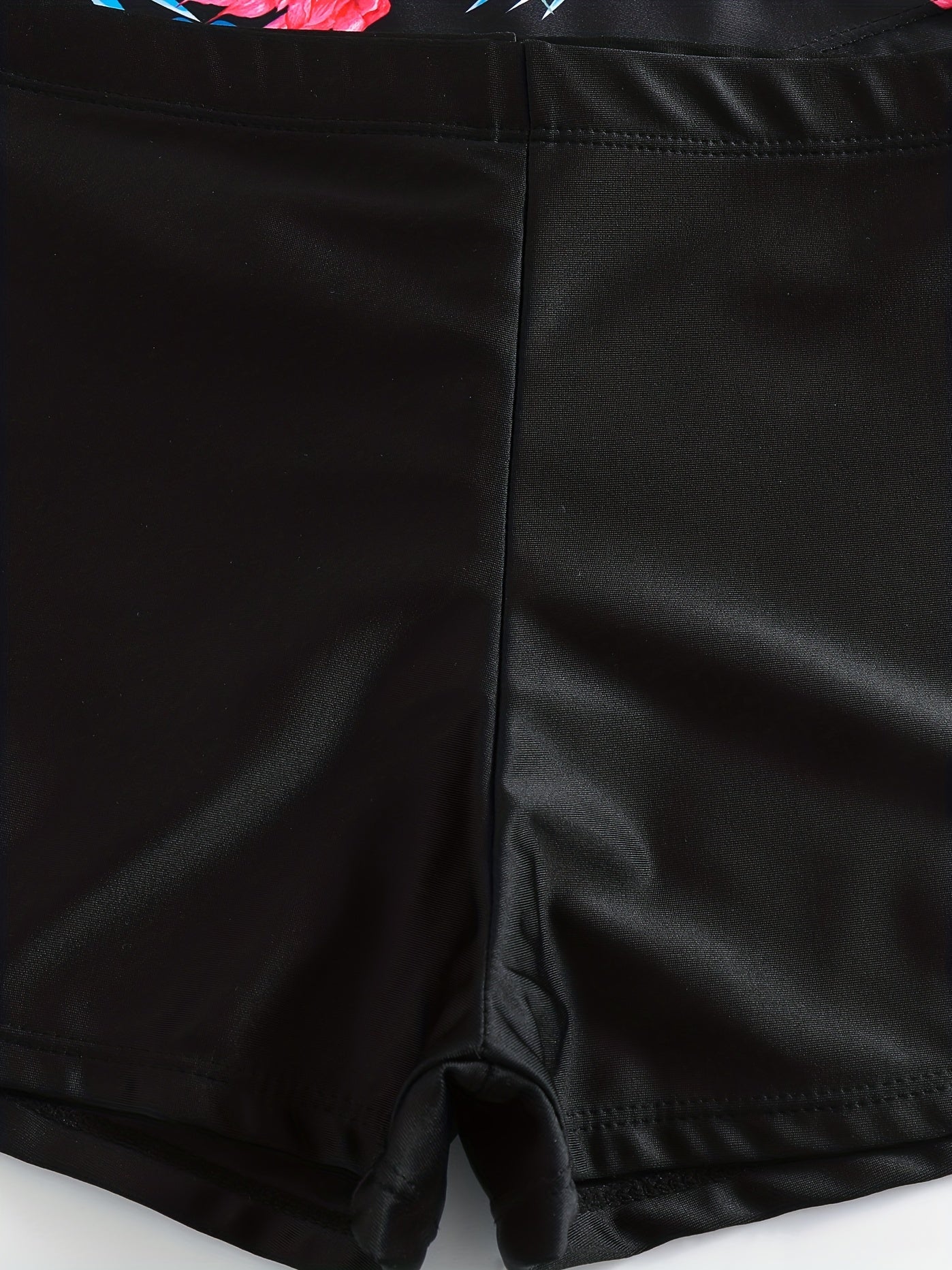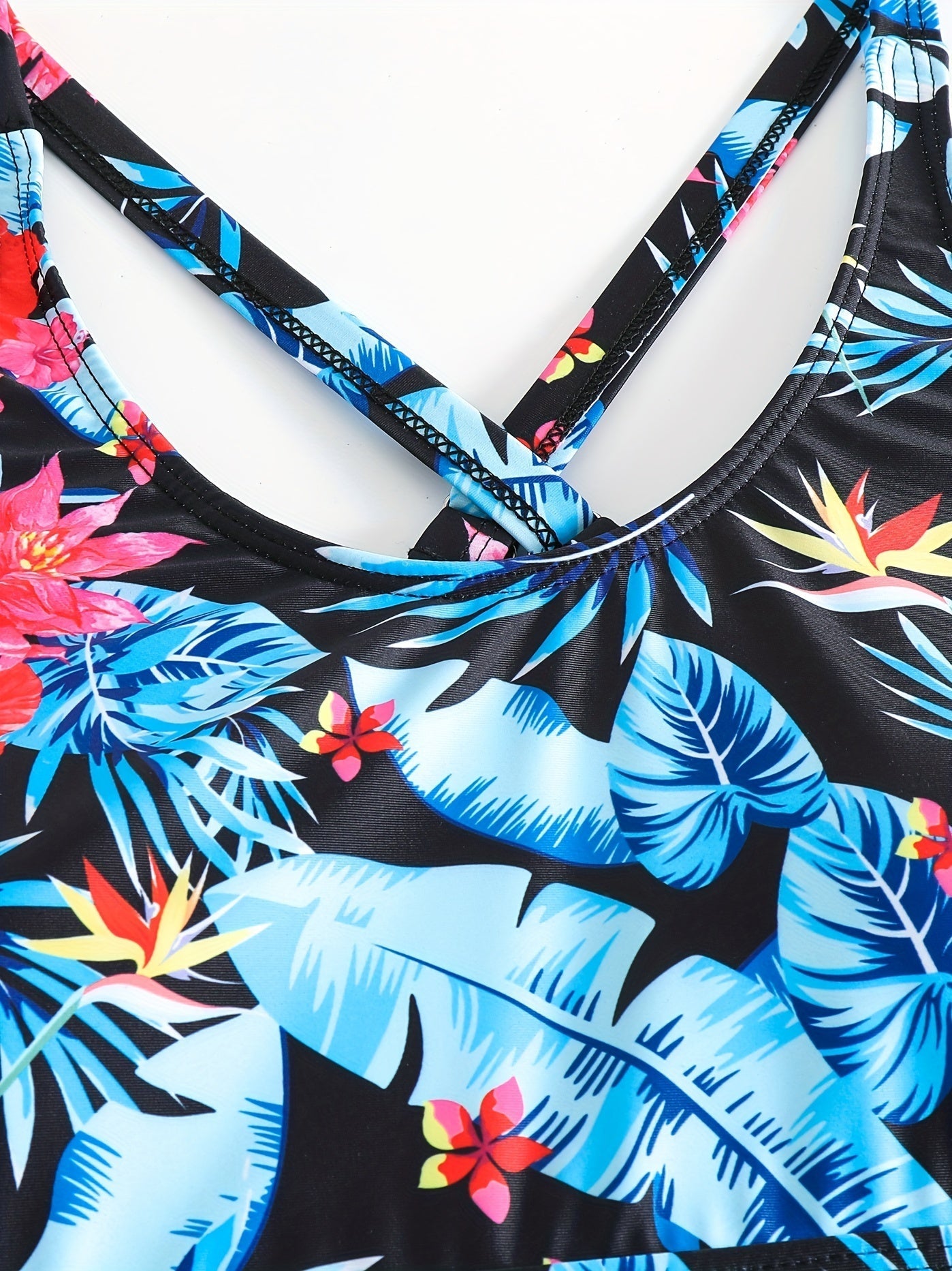 Tropical Print Round Neck Tankini Sets, Drawstring Straps Boxer Short Bottom Two Pieces Swimsuit