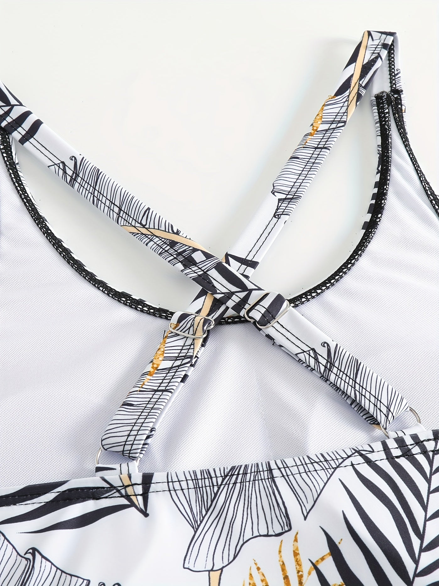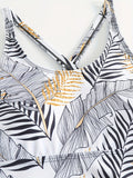 Sale 3-Piece Leaf Plant Print Bikini Sets, Triangle Halter Neck High Cut With Sheer Cover Up Drawstring Overall Swimsuit