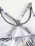 Sale Black & White Paisley Floral Print Knot 2 Piece Set Bikini, Ring Hollow Out Stretchy Cross Top & Skorts Swimsuits
