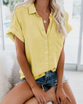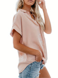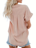 V Neck Collared Button Blouses, Casual Pocket Short Sleeve Fashion Loose Shirt