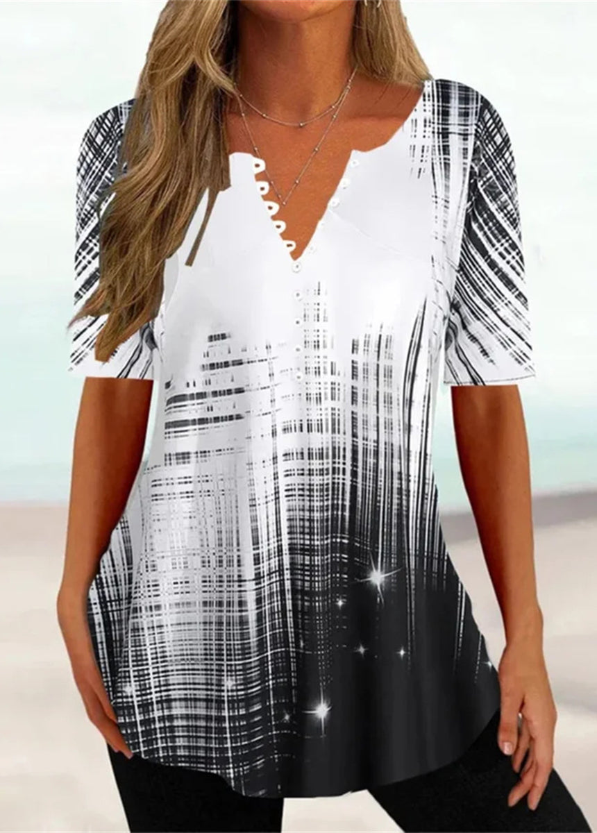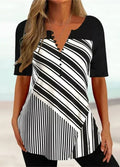 V-Neck Short Sleeve Button Striped Print T-Shirt