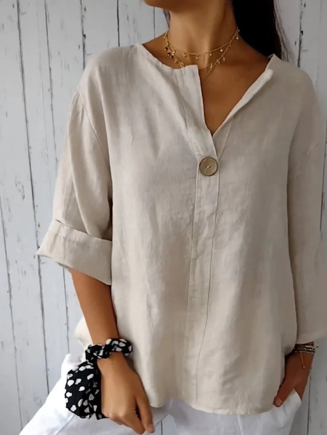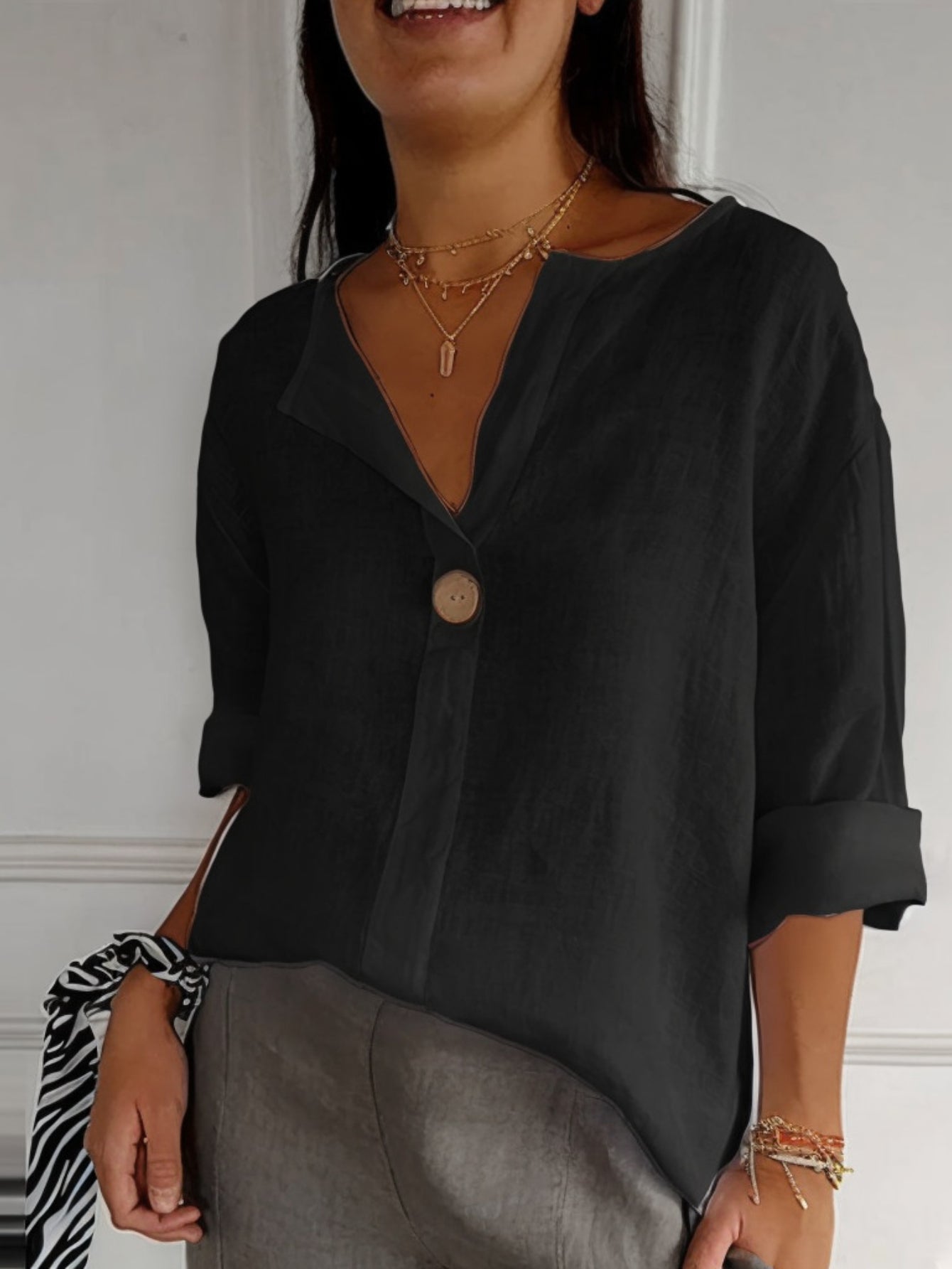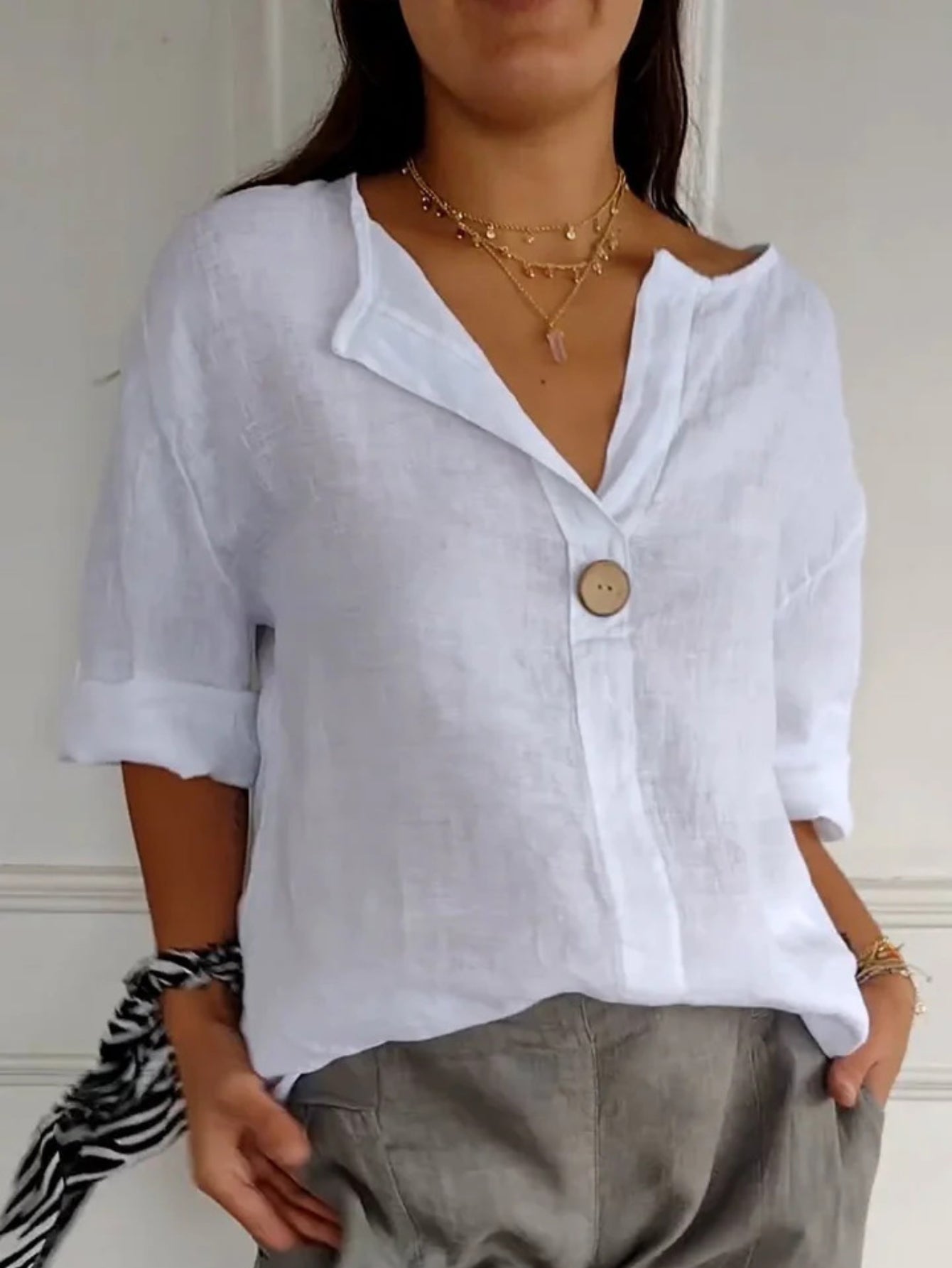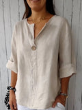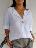 V Neck Three Quarter Sleeve Plain Buttoned Regular Loose Blouse