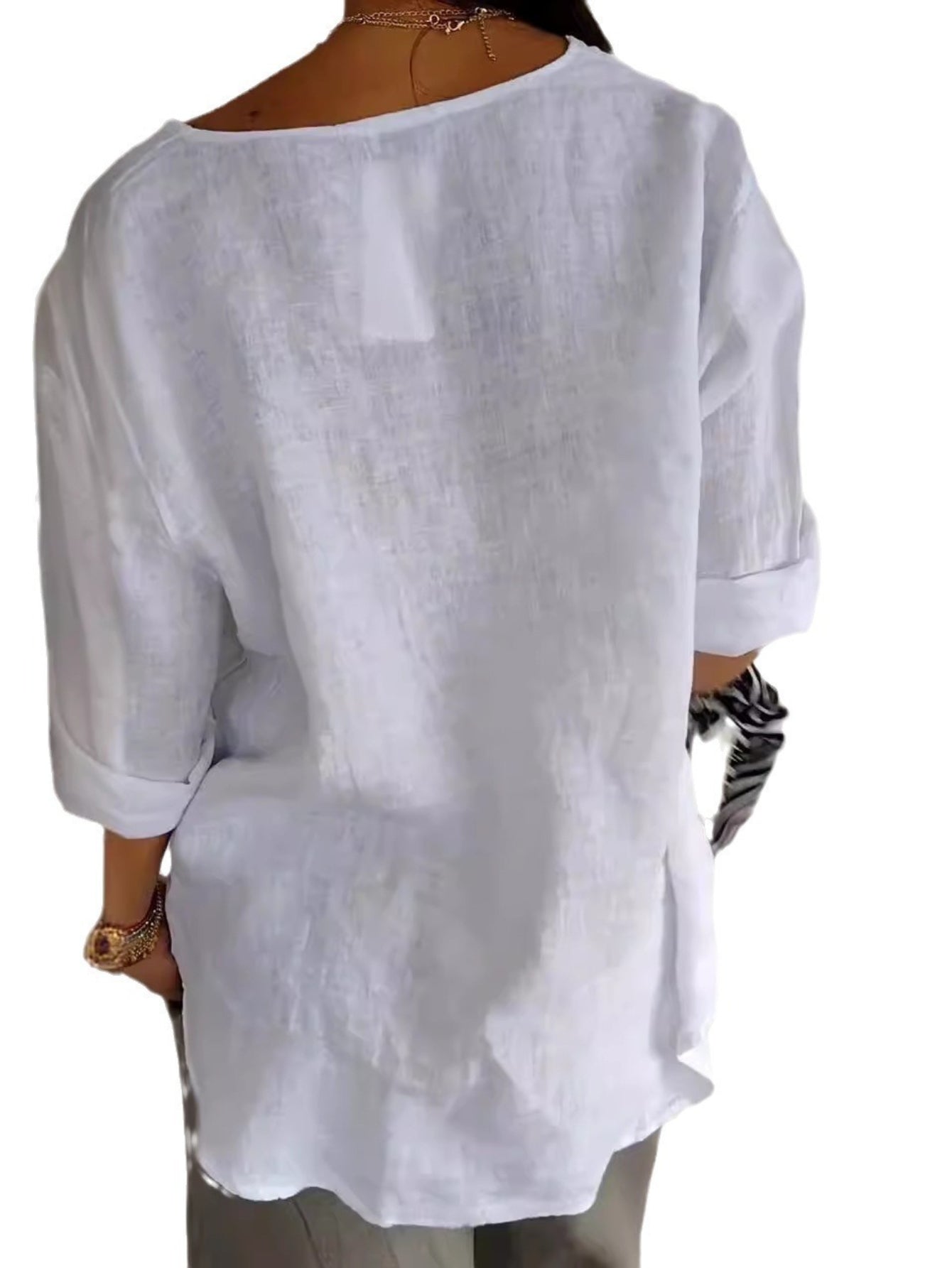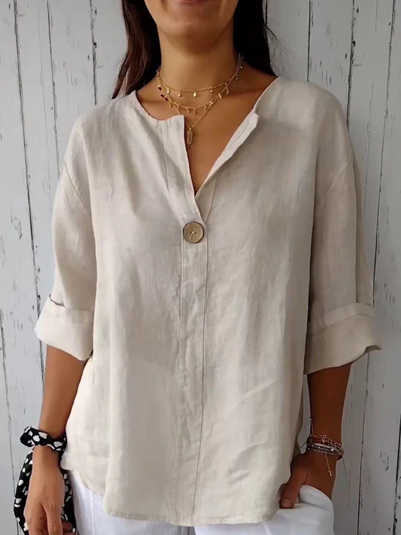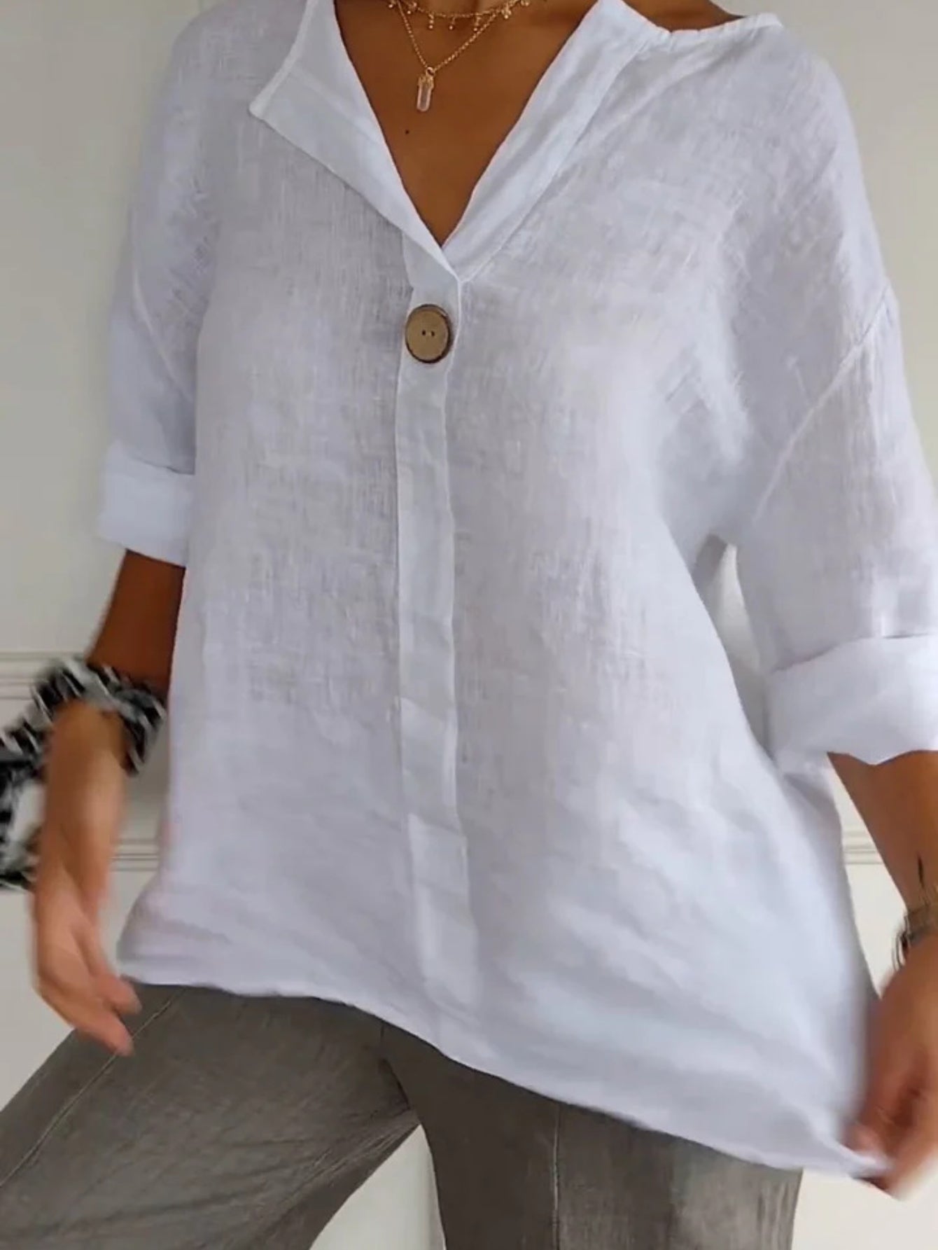V Neck Three Quarter Sleeve Plain Buttoned Regular Loose Blouse