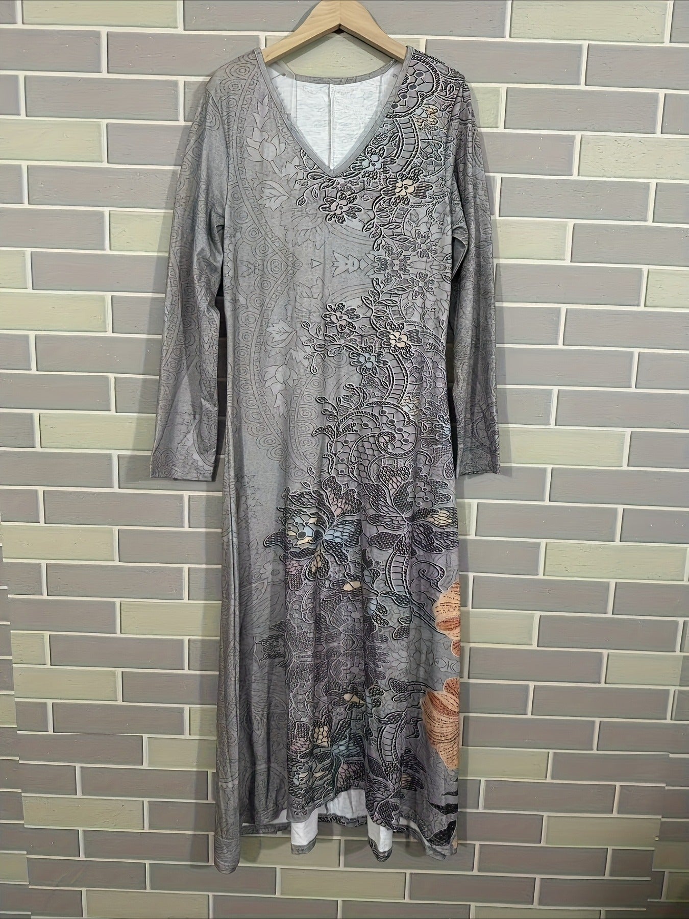 Sale Vintage Casual Daily Regular Fit Floral Long Sleeve V Neck Maxi Dress
