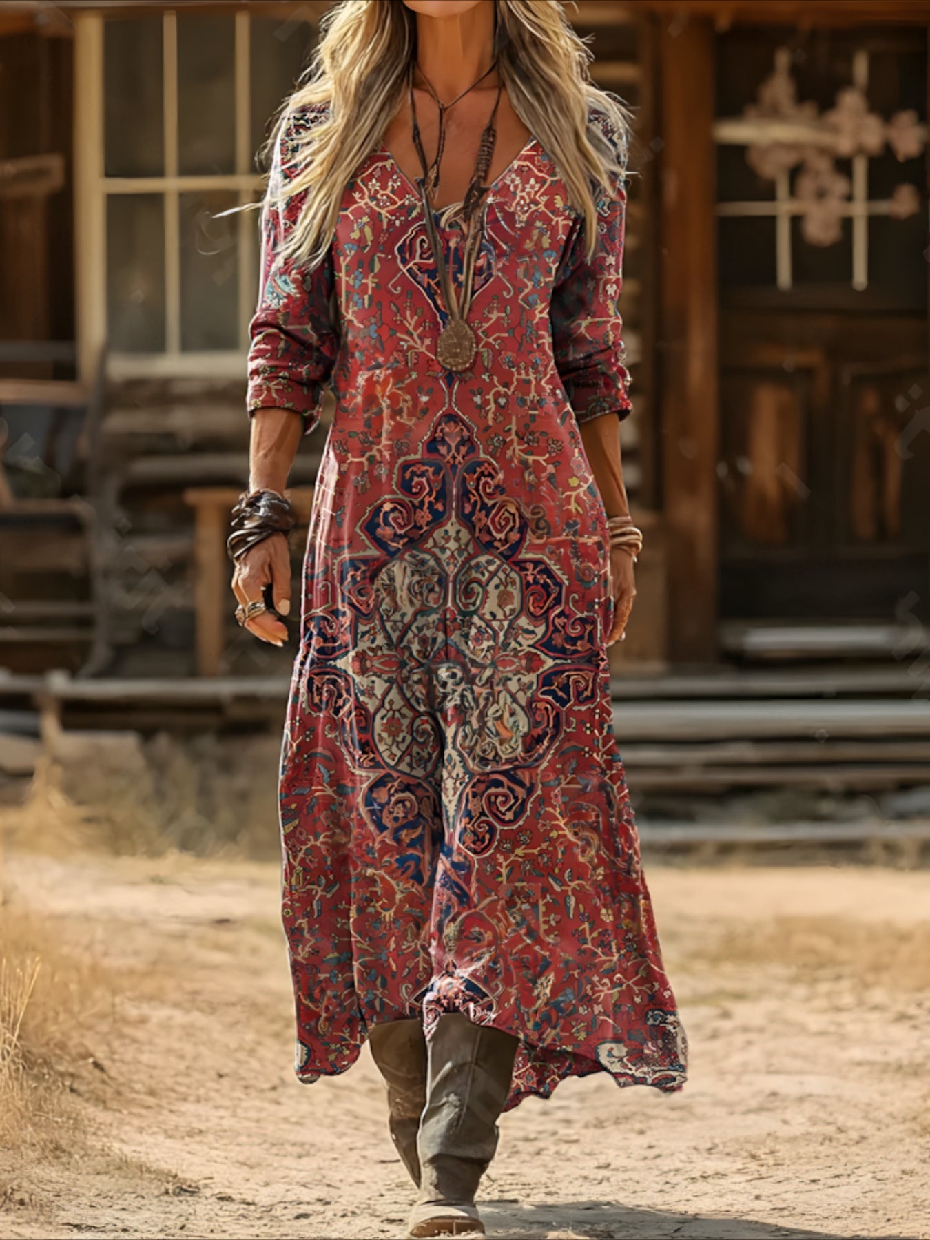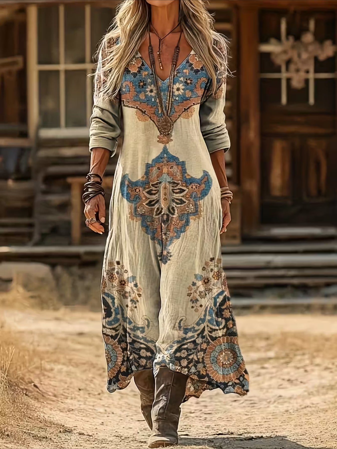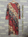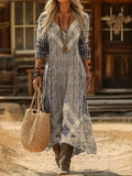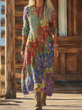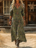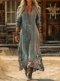 Vintage Ethnic Floral Digital Print Long Sleeve Dress