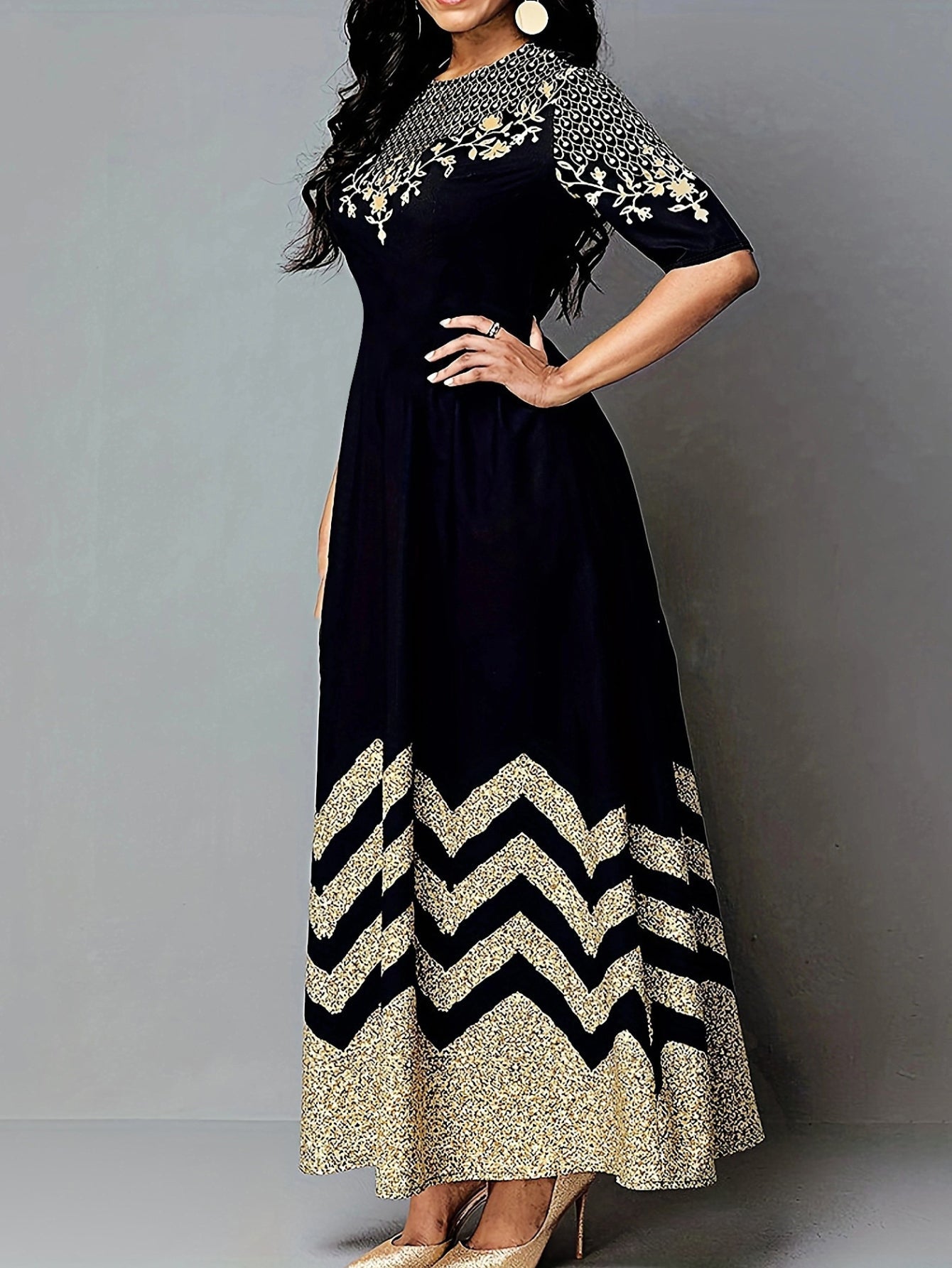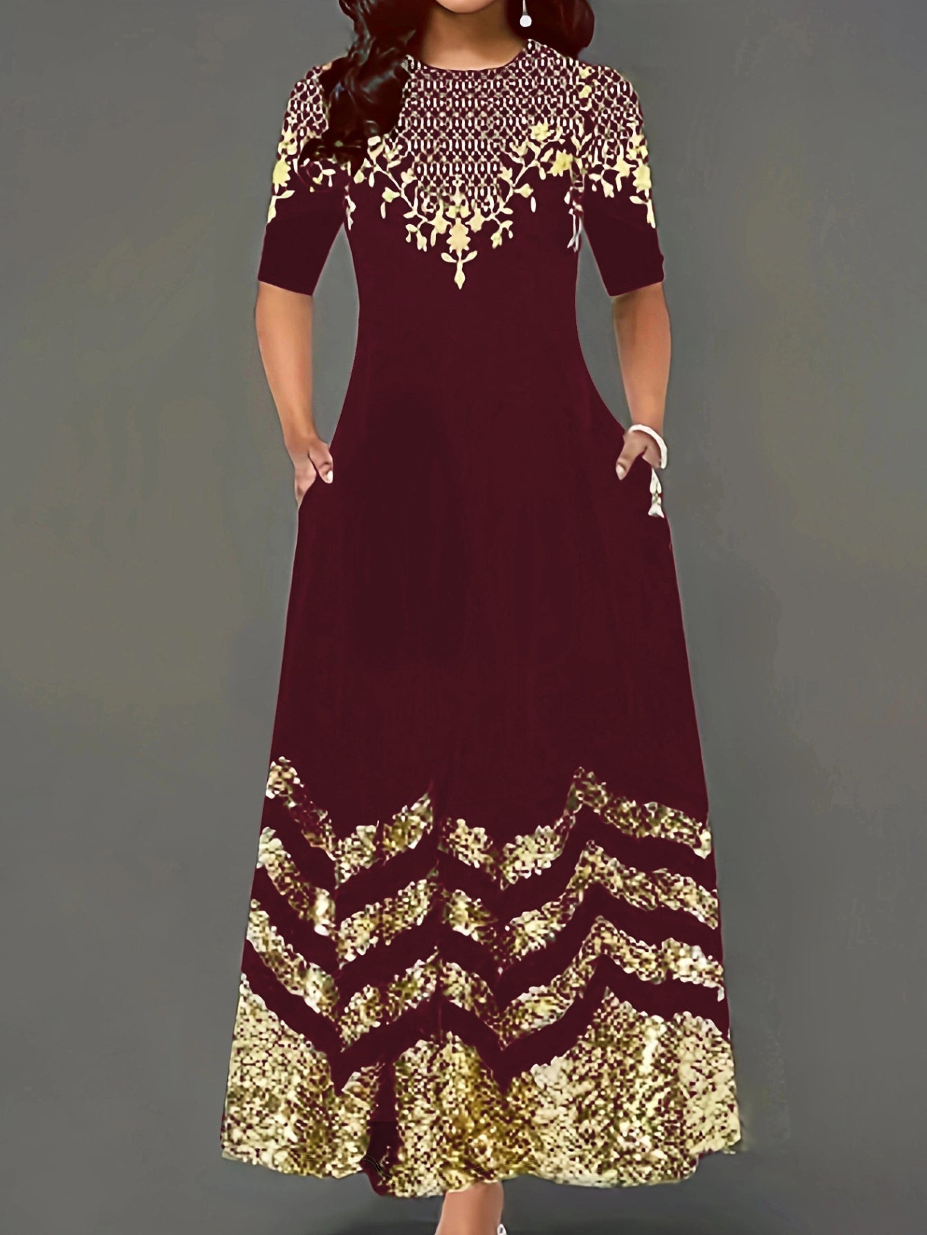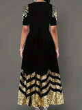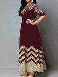 Vintage Tribal Print Crew Neck Pocket Dress, Women's Short Sleeve Wave Stripe Print Dress