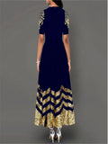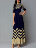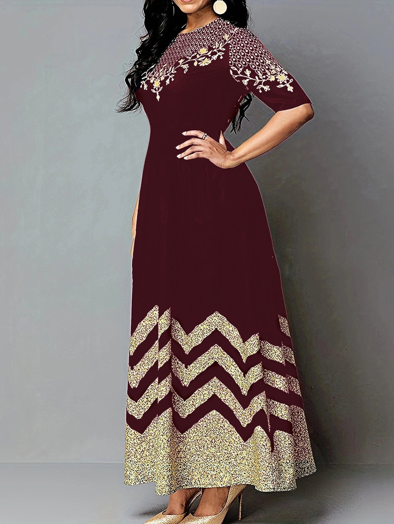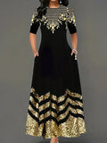 Sale Tribal Print Crew Neck Panel Dress, Casual Long Sleeve Loose Maxi Dress