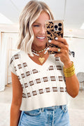White Contrast Geometric Textured Knit V Neck Cropped Sweater Vest