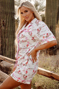 - The perfect sleep set for both comfort and style.Features a button-up top with short sleeves and matching shorts with pockets.The cowgirl country print is funny to keep wearers looking good while you relax.The fabric is ultra-soft, stretchy and lightweight for a relaxed feel.