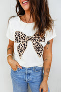 White Leopard Bow Embroidered Cotton Round Neck T Shirt