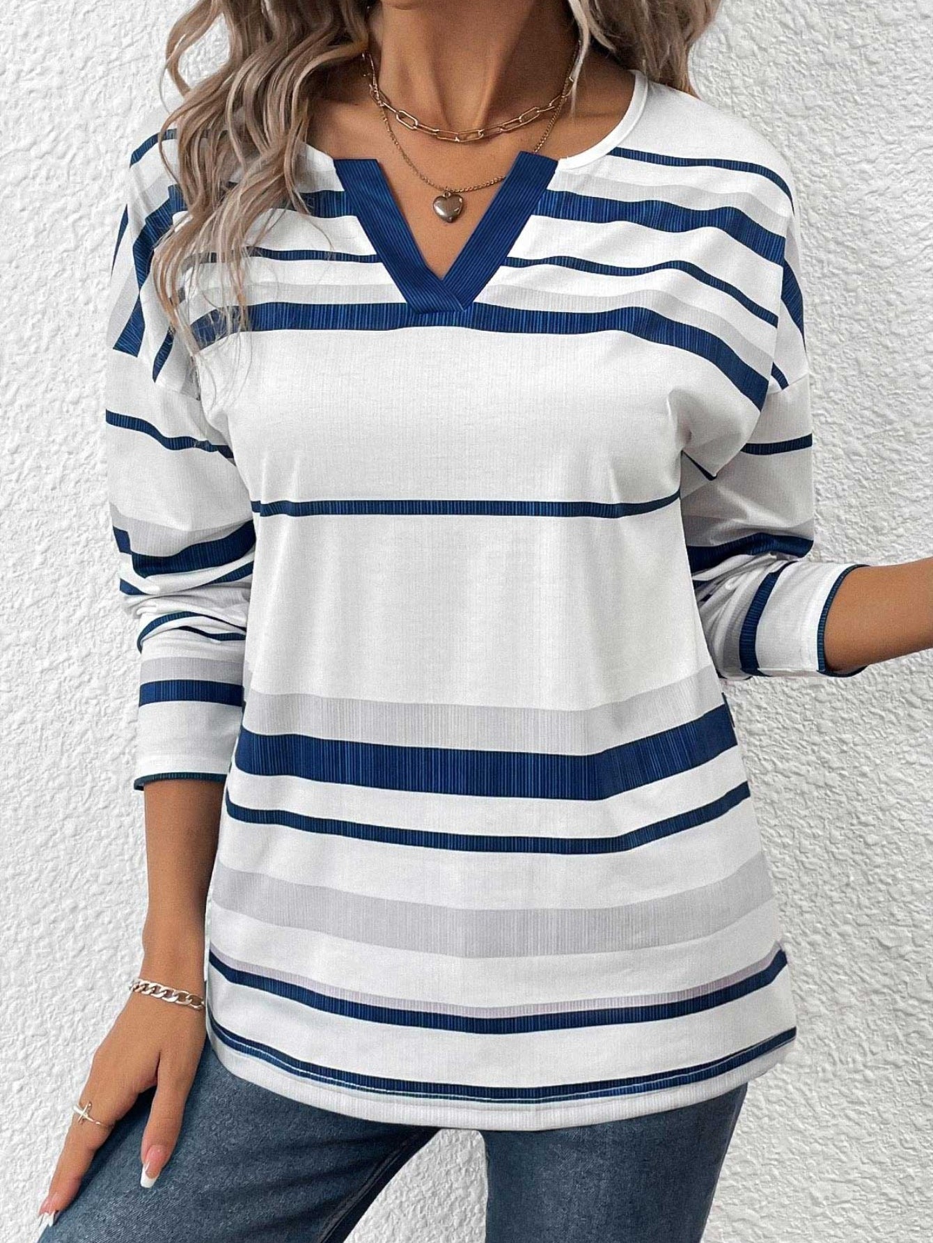 White Patchwork Striped Long Sleeve Split Neck T Shirt